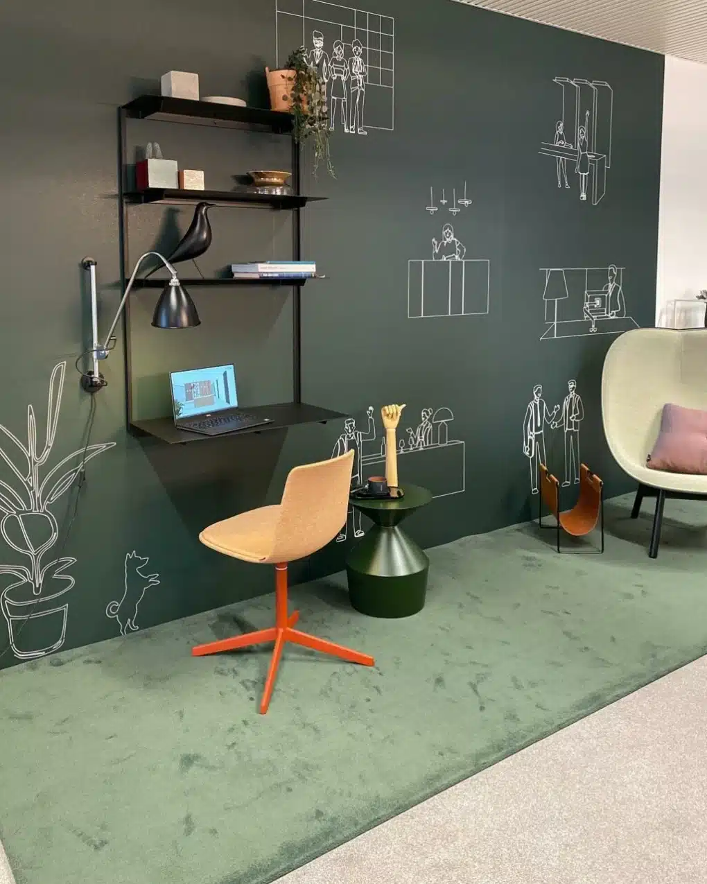 - Impressions murales. Vous ne trouvez pas votre bonheur dans les motifs de papier peint standard ? Alors il est certainement intéressant d’envisager de recouvrir vos murs de bureau avec de grandes impressions, un point focal décoratif qui n’occupe pas d’espace supplémentaire. Conseil : vous pouvez également appliquer des impressions au sol. Tendance et élégant.