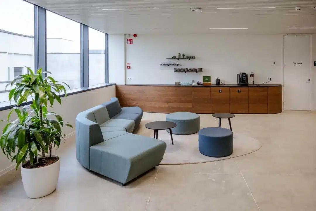 Le bâtiment a été conçu par Derveaux Architecten, avec un souci de lumière, d’ouverture et d’expérience. Nous avons traduit cette vision architecturale en un aménagement qui donne l’impression de rentrer chez soi. Les parois vitrées et l’éclairage aux formes organiques créent une atmosphère lumineuse et ouverte. Les matériaux chaleureux comme le bois, la moquette et le textile apportent confort et acoustique agréable. Les teintes bleu-gris et les formes arrondies maintiennent l’ensemble serein et professionnel, un lieu où l’on aime être, et où l’on préfère encore travailler.