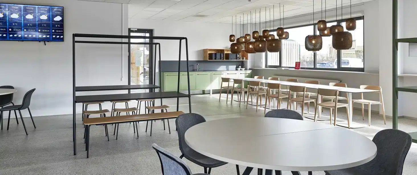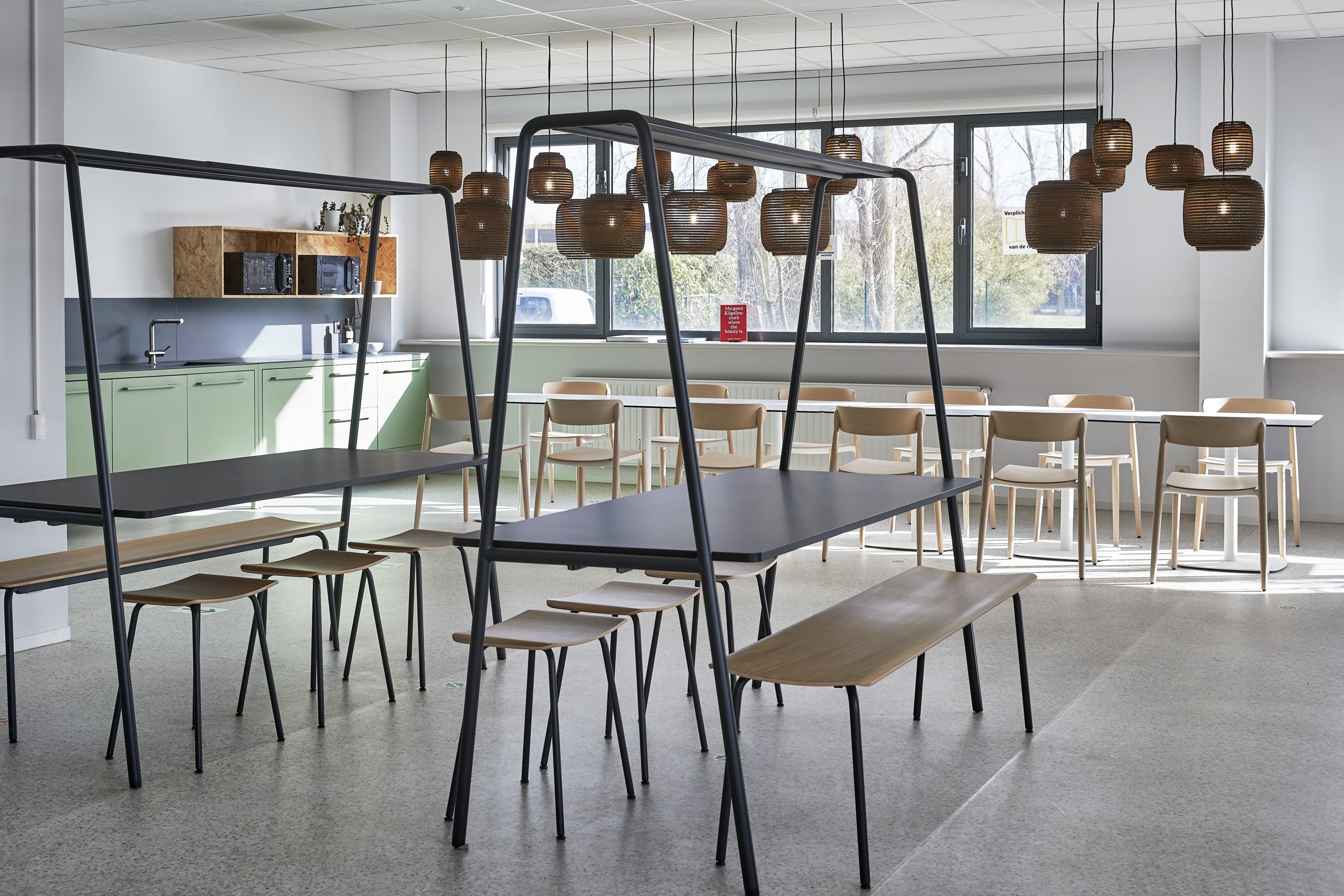 En tant que bureau de design, nous recherchons constamment des moyens innovants d’obtenir un environnement de travail bénéfique tout en améliorant la productivité. Dans le cas de Die Keure, l’imprimerie et maison d’édition de premier plan, cela a signifié une transformation de leur cafétéria et espace de pause en un lieu de rencontre flexible. Un endroit accueillant qui peut également facilement accueillir les employés qui ne sont au bureau que quelques jours par semaine et travaillent le reste du temps à domicile. L’objectif final : offrir confort et sécurité à tous les niveaux et s’assurer que chaque collègue se sente détendu.