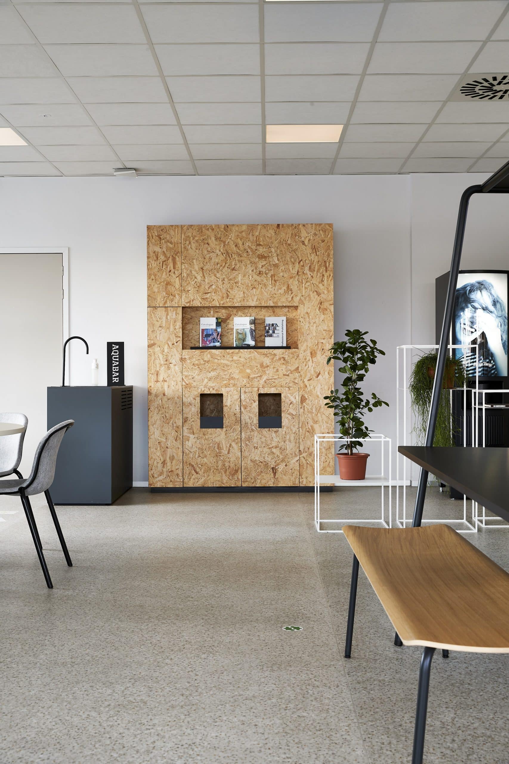 Avec l’émergence des concepts de bureaux ouverts, des postes de travail modulaires et des aménagements variables, nous avons choisi de combiner différentes fonctions d’assise. Pour favoriser une atmosphère conviviale, nous avons ajouté des éléments résidentiels, tels que des canapés et chaises confortables, un éclairage d’ambiance et des plantes d’intérieur. L’utilisation caractéristique des couleurs et matériaux accentue à son tour l’identité visuelle de Die Keure et l’atmosphère informelle de l’espace.