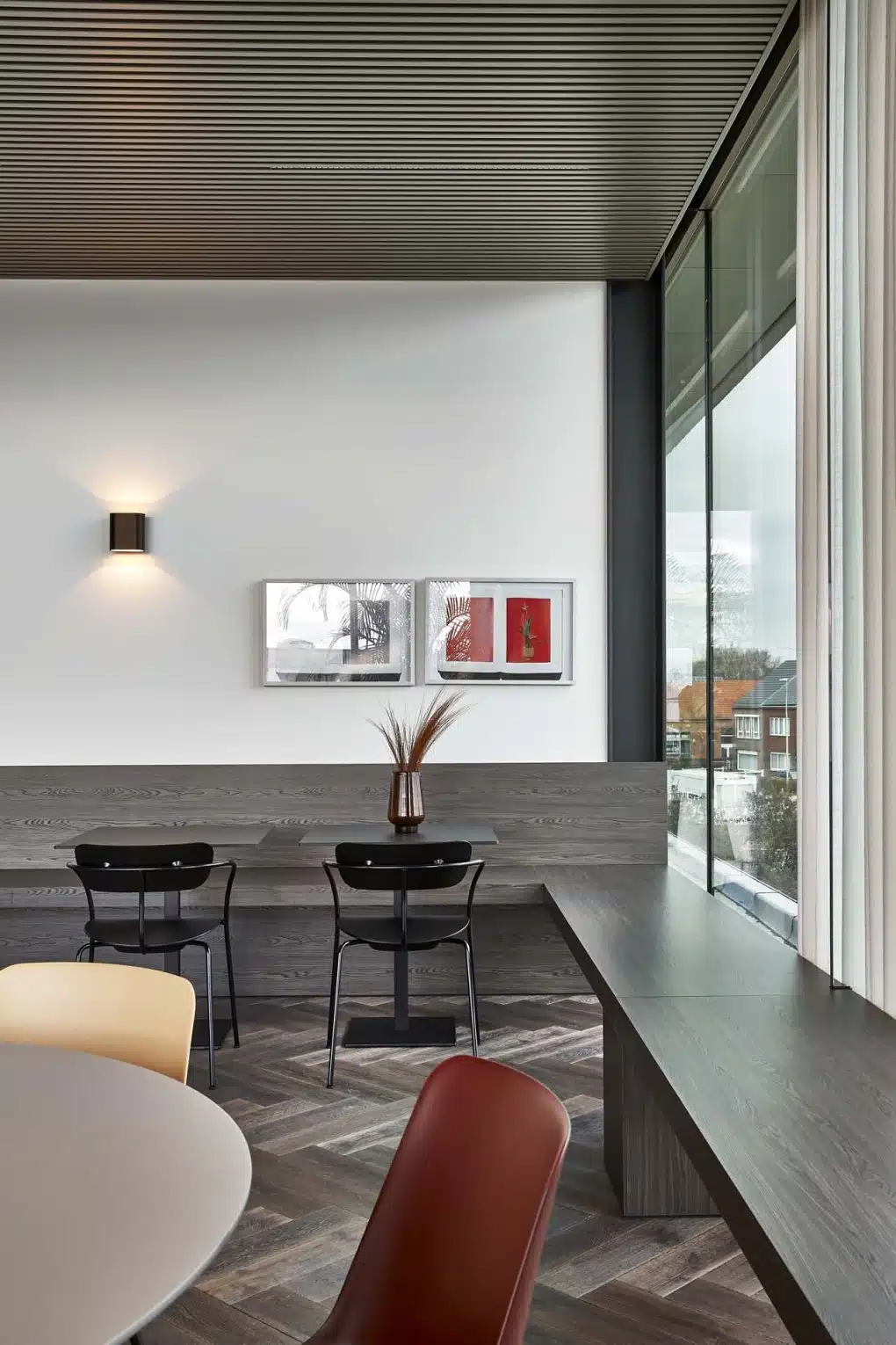 De houten accenten en het spel van licht en schaduw in de ruimte bij De Clerck zorgen voor een warme, natuurlijke sfeer waarin je automatisch tot rust komt.