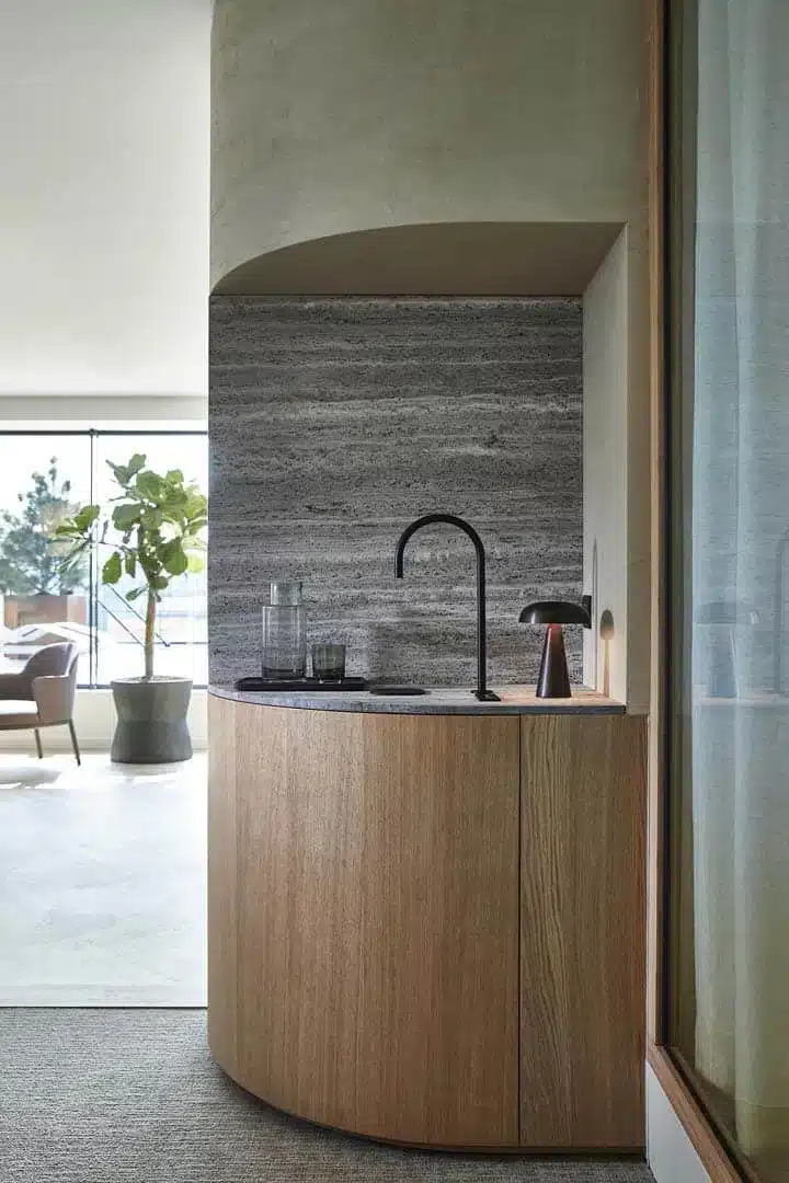 Bij Moore Brussel kozen we bewust voor walnoot en marmer, een combinatie die luxe uitstraalt zonder afstandelijk te zijn.