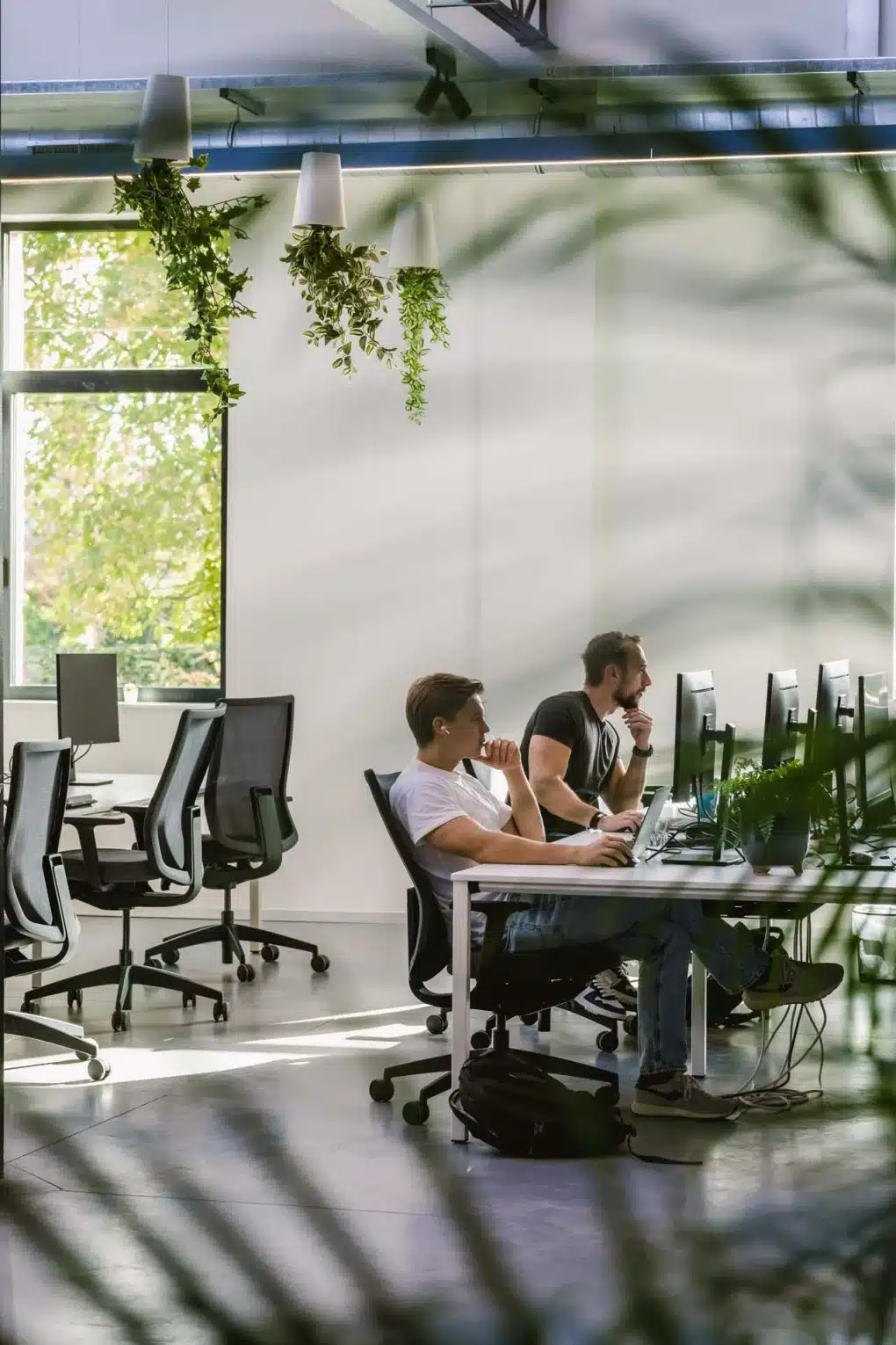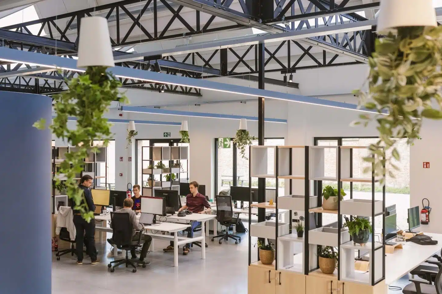 Bij onze inrichting voor Cronos aan de Leie werkten we met een combinatie van hangplanten en grote potplanten. Die mix zorgt niet alleen voor sfeer, maar ook voor natuurlijke afscheiding, betere akoestiek en zuurstofrijke lucht.