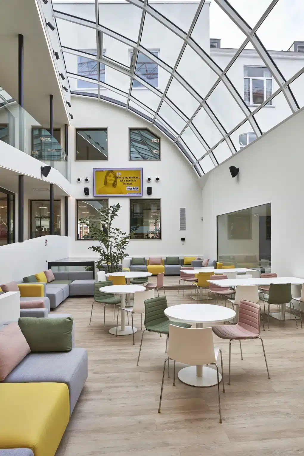 De grote dakkoepel van Europabank trekt enorm veel daglicht binnen en zorgt voor een open gevoel.