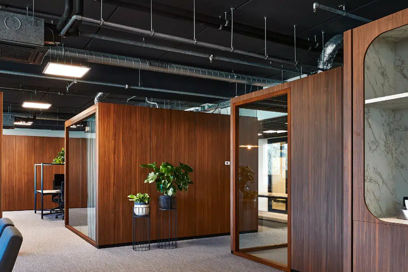 Bij Amcor zorgen glazen wanden en organisch gevormde verlichting voor een lichte, open sfeer.