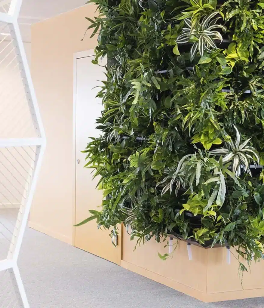 In een biophilic kantoor draait het ook om wat je hoort, ruikt en voelt. Denk aan het rustgevende geluid van stromend water, de geur van natuurlijke materialen zoals hout of lavendel, en een tactiele mix van materialen zoals wol, glas, vilt of bamboe.