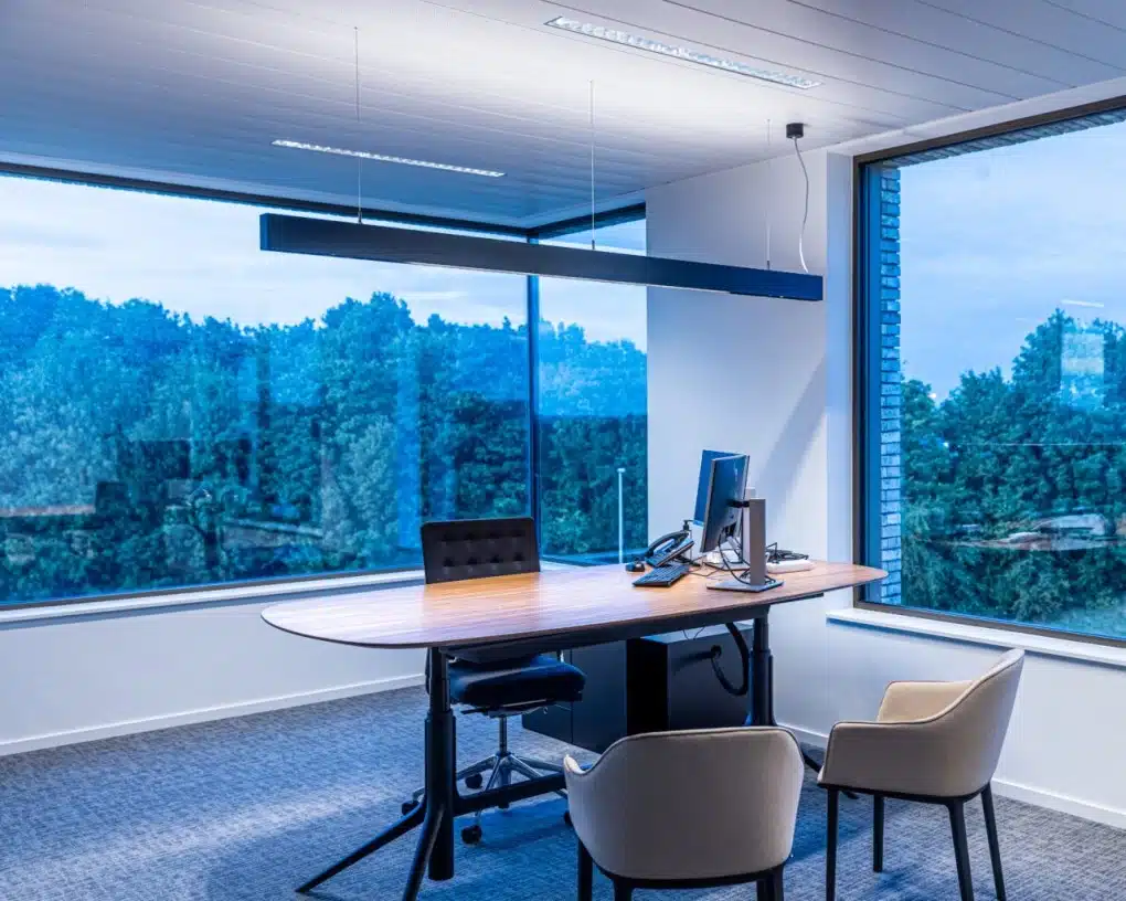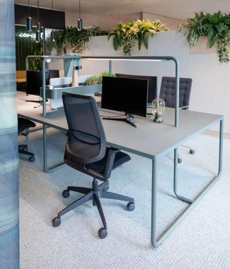 Heel veel van onze kantoorinrichtingen bevatten zit-stabureaus. Die verstel je makkelijk in hoogte, waardoor werknemers zelf kiezen hoe ze het liefste werken: zitten of staan, of afwisselen tussen de twee. Het kan allemaal. En de bureaus zien er ook gewoon cool uit. Kijk maar eens naar dit pareltje bij onze klant Gates