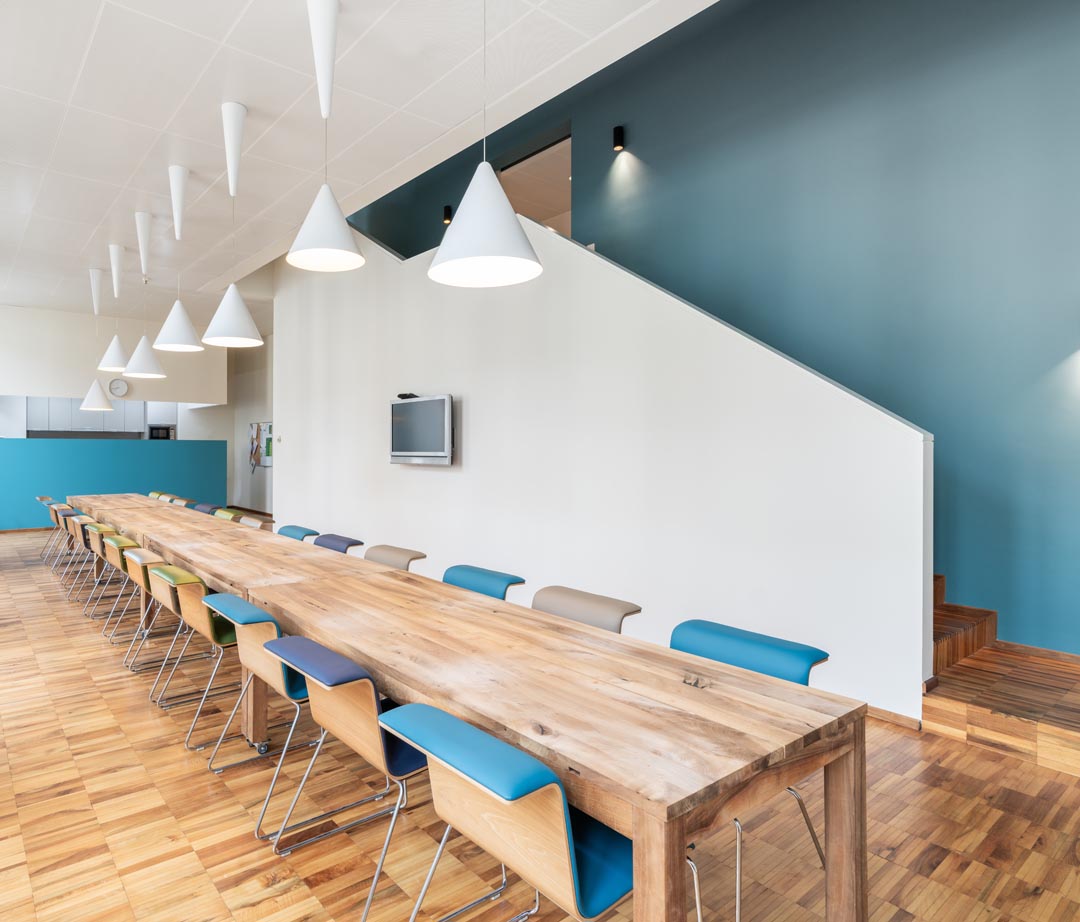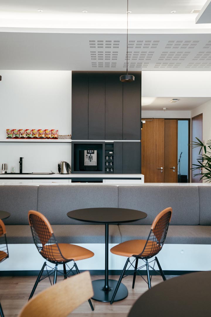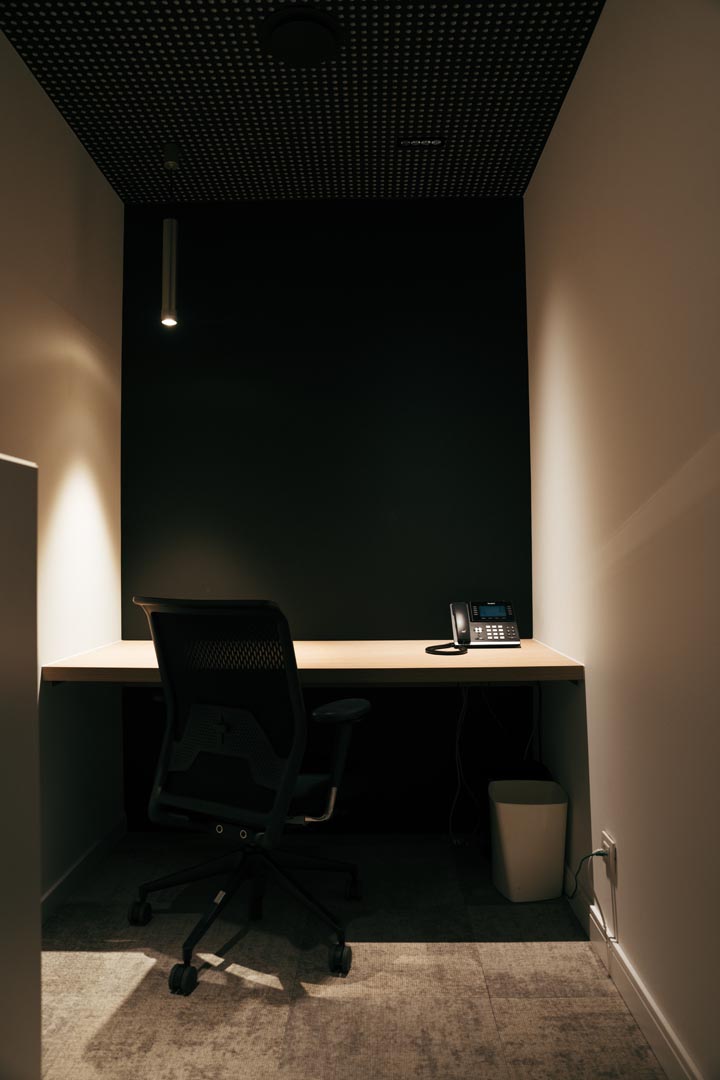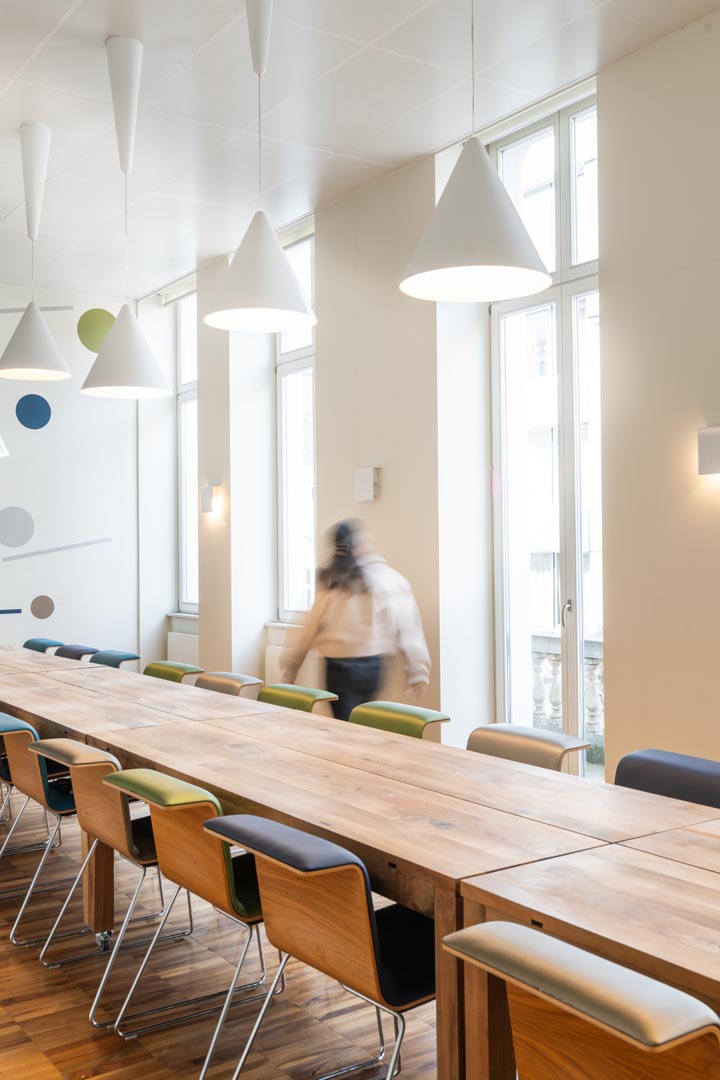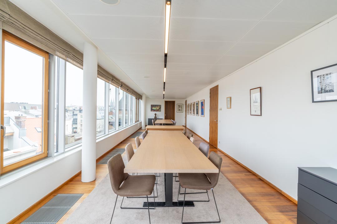 Strakke lijnen en warme tinten zorgen voor een uitnodigende sfeer, terwijl de tijdloze elegantie van het meubilair de ruimtes een professionele uitstraling geeft. Elk detail draagt bij aan een omgeving waarin medewerkers zich kunnen concentreren, samenwerken en inspireren, van co-working zones tot informele vergaderplekken.