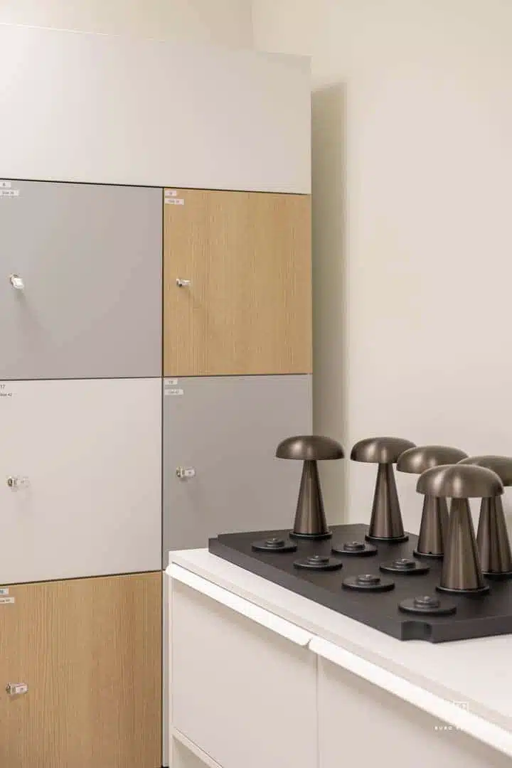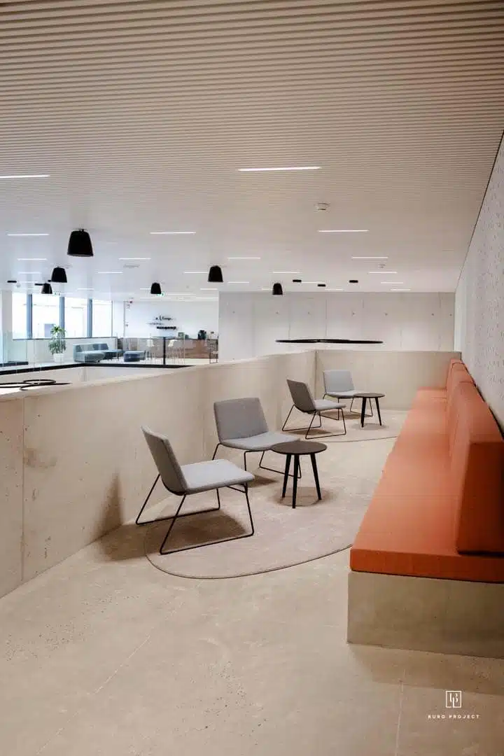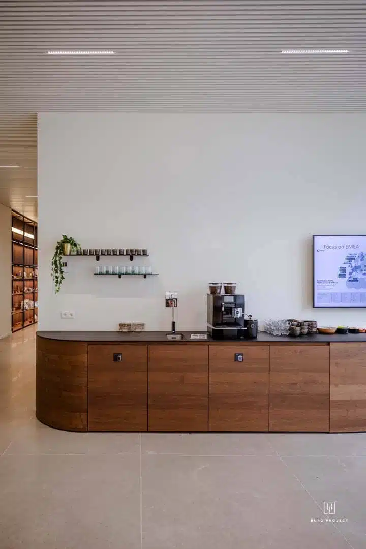 Even een kort gesprek met een collega? Dat doe je hier gewoon onderweg naar je koffie. Dankzij de gezellige coffee corners en slangvormige zitbanken ontstaan er spontaan connecties, en dat is precies de bedoeling. De afgeronde houten koffiebars met organische vormen zijn het stralende middelpunt. Warm, uitnodigend, en vooral: heerlijk huiselijk.