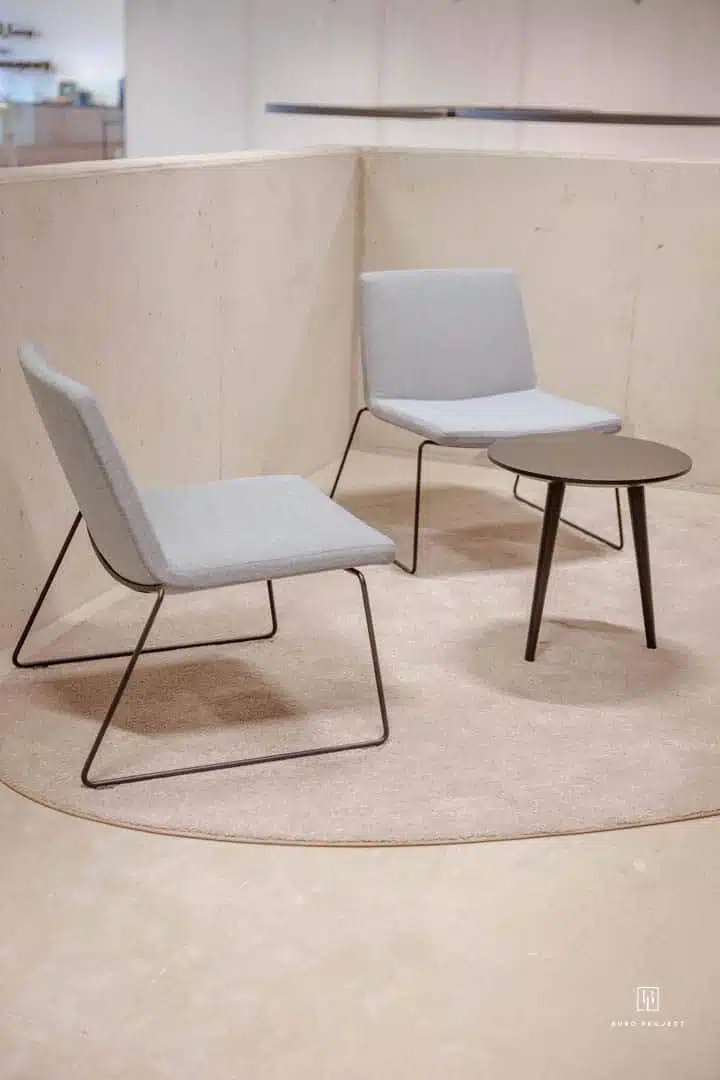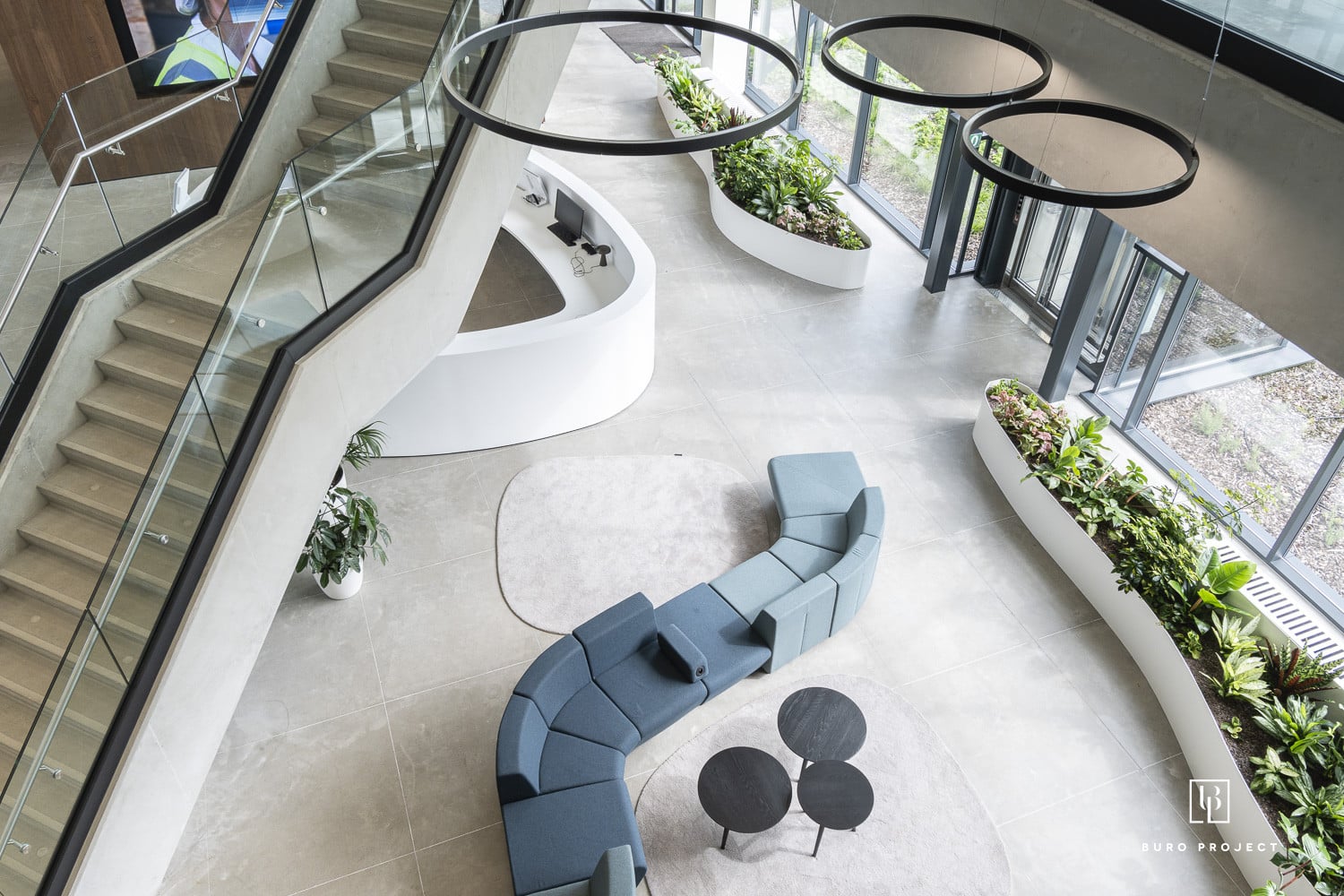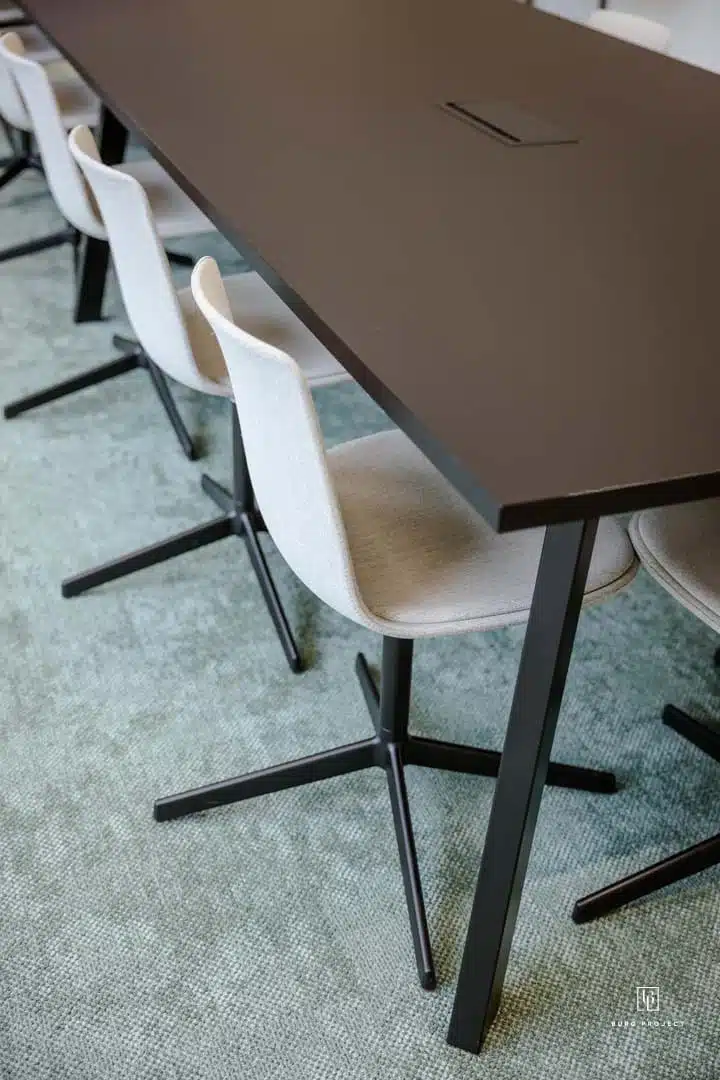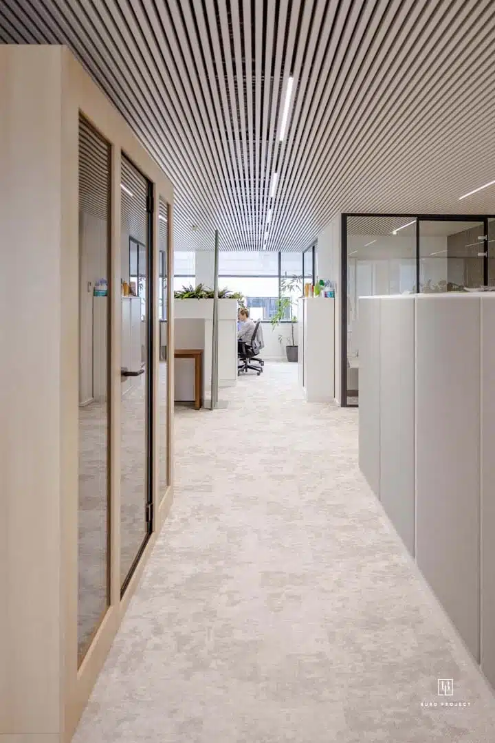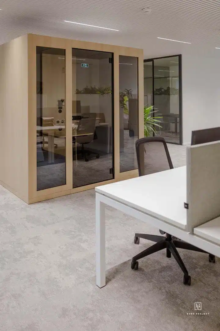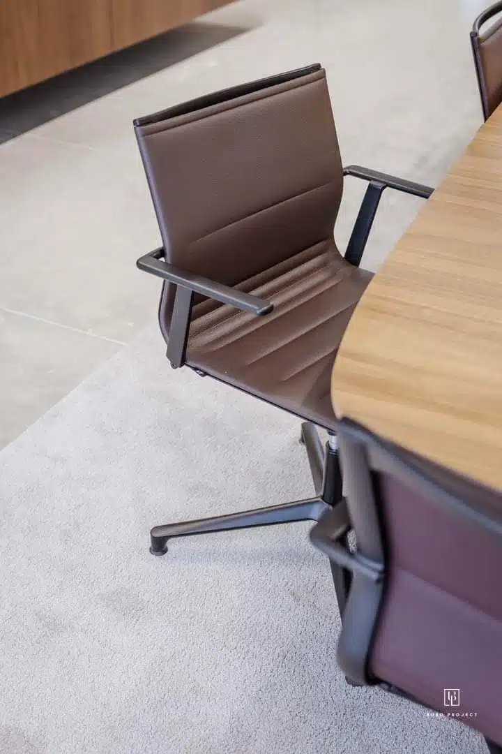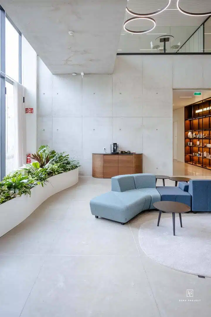 Het gebouw werd ontworpen door Derveaux Architecten, met oog voor licht, openheid en beleving. Wij vertaalden die architecturale visie naar een inrichting die aanvoelt als thuiskomen. Glazen wanden en organisch gevormde verlichting zorgen voor een lichte, open sfeer. Warme materialen zoals hout, tapijt en textiel brengen comfort en een aangename akoestiek. De blauwgrijze tinten en afgeronde vormen houden het geheel sereen en professioneel, een plek waar je graag bent, en nog liever werkt.