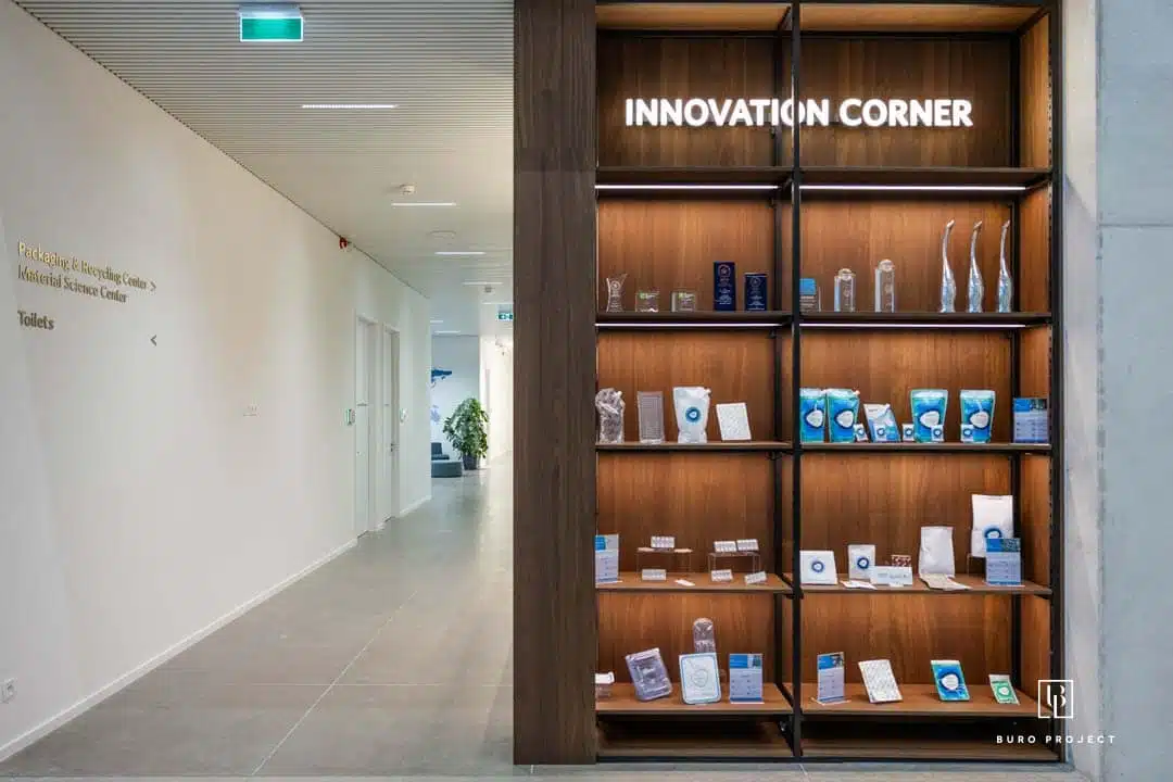 Beneden draait alles rond beleving voor de klant. In het experience center wandelen bezoekers door levensechte toepassingen zoals een badkamer of keuken. Zo kunnen ze Amcors producten echt ervaren in een omgeving die de eindgebruiker weerspiegelt. Ook het analytisch labo is een troef: daar zie je hoe prototypes ontstaan, tot in het kleinste detail.