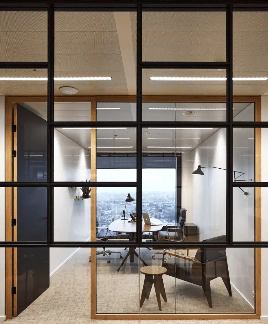 De prachtige stadsgezichten en het natuurlijke lichtinval speelden een belangrijke rol in de keuze van de texturen en het kleurgebruik. Voor de aankleding kozen we voor een mix van subtiele tinten en natuurlijke materialen met industriële afwerkingen die samen een ongedwongen sfeer teweegbrachten. Centraal bevindt zich de verhoogde sky lounge waarrond de meeting rooms, afgesloten kantoren, grote meeting room en open space werkplekken zijn gebouwd.