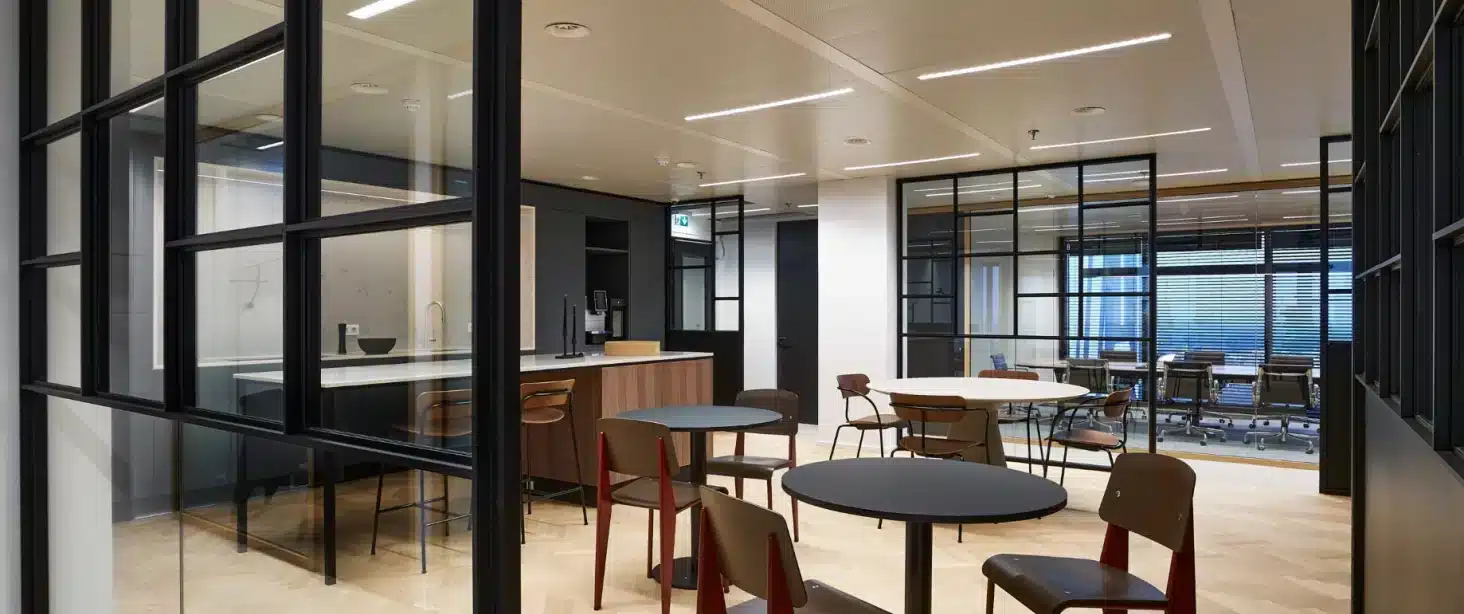 Slimme kantoorinrichting vraagt om doordachte ruimteplanning. Op 295 m² tekenden we een indeling uit die zowel rust als dynamiek toelaat. De verhoogde sky lounge kreeg een centrale plek, met errond strategisch geplaatste meeting rooms, gesloten kantoren en open werkplekken. Alles in harmonie, met aandacht voor daglicht, zichtlijnen en vlot circuleren.