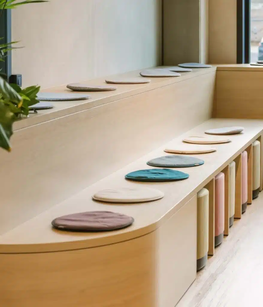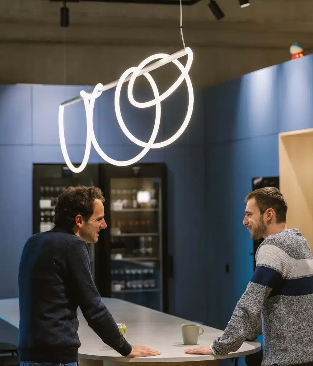 Bij binnenkomst valt meteen de harmonieuze balans tussen openheid en geborgenheid op. Ronde vormen en warme kleuren creëren een huiselijke sfeer, terwijl functionele elementen zoals akoestische wanden en strategisch geplaatste werkzones zorgen voor een optimale werkdynamiek. Het kantoor is niet zomaar een werkplek; het is een ruimte die inspireert en stimuleert, met unieke details zoals roze banken in de bistro en een amfitheater dat slim werd geïntegreerd.
