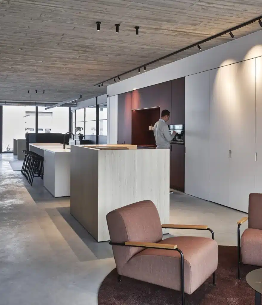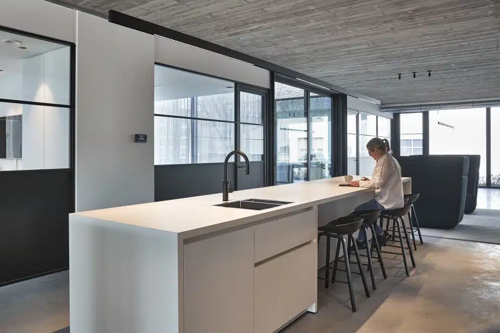 “Daarnaast moest ons nieuwe kantoor een echte ontmoetingsplek zijn”, gaat Angelo verder. “Zowel voor onze klanten als medewerkers. Een ruimte waar mensen binnenstappen en meteen een goed gevoel bij hebben.” En dus betrok de zaakvoerder zijn personeel van dichtbij bij de conceptfase. “Op basis van alle interne feedback werd het ontwerp verder verfijnd tot een mooie, functionele werkplek met de keuken als kloppend hart.”