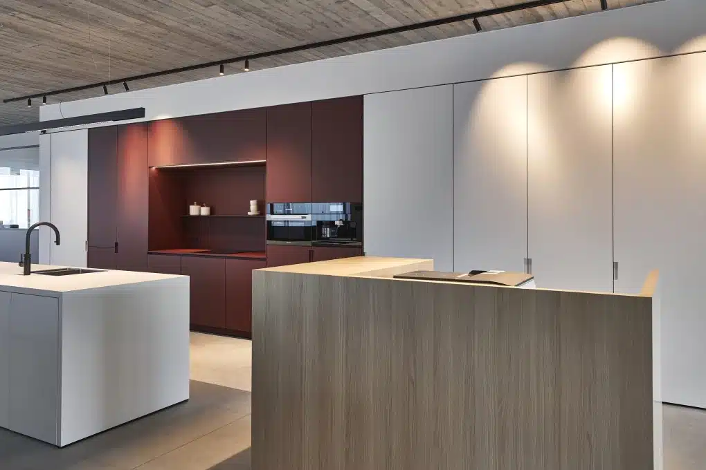Beelden zeggen soms meer dan woorden. Daarom stelden we een moodboard samen dat meteen de juiste sfeer opriep: warm, elegant en een tikje industrieel. We kozen bewust voor bordeaux rood, de huisstijlkleur van De Buck, als accentkleur. Die komt terug in de keukenwand, de stoffering én het logo. Daarnaast gaven zwarte frames en sobere materialen het geheel een strakke, tijdloze uitstraling.