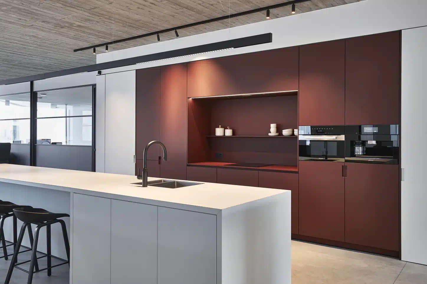 Het meubilair hielden Natalie en haar collega’s bewust strak en neutraal: “De burelen in eik fineer en laminaat contrasteren heel mooi met de witte muren en zwarte accenten. Voor de keukenwand en stoelstoffering kozen we bordeaux, de huisstijlkleur van De Buck die we ook in het logo terugvinden. Alles vormt een tijdloos geheel, met de keuken als trendy eyecatcher.” “We schonken ook veel aandacht aan het uitlijnen van de in- en uitsprongen”, vervolledigt Angelo. “Daarom oogt alles sober, maar toch niet kil, dankzij Natalie’s warme kleurenpallet. Wij zijn heel tevreden met het eindresultaat: een hedendaagse look, mede door de moderne betonvloeren en strakke meubels.”