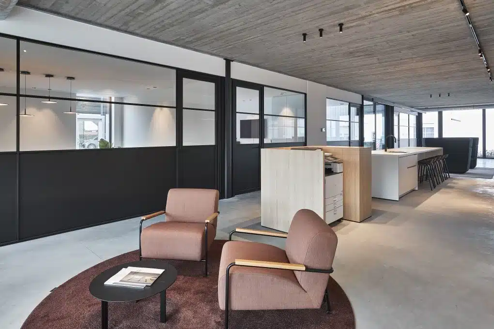 Buro Project drukte zijn stempel van de eerste schets tot en met de oplevering. “Met enkele subtiele accentkleuren kreeg de industriële look – voornamelijk zwart en grijs – toch een warm tintje”, bevestigt Natalie Kennes van Buro Project, die als interieurarchitect het totaalconcept uittekende. “Op vraag van de klant bleef de ruwbouw zichtbaar – als knipoog naar hun core business. Maar de betonstructuren werden extra uitgelicht met sobere ledverlichting, wat bijdraagt aan de gezellige sfeer en het ruimtegevoel.”