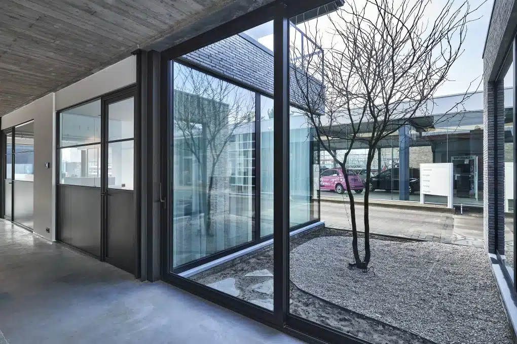 Naast de keuken ligt een ruime patio, omringd door grote glaspartijen, waardoor buiten bijna letterlijk naar binnen wordt getrokken. “Bij mooi weer kunnen we onze klanten dus ook in de openlucht ontvangen”, glundert Angelo die de vergelijking maakt met een drukbezochte oase in een savanne. “Op termijn wil ik hier ook drie keer per jaar een netwerkevent met regionale ondernemers laten doorgaan. Dit is hiervoor de ideale plek.”