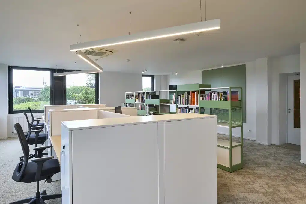 Van plannen naar praktijk! Tijdens de uitvoering hebben we nauw samengewerkt met aannemers en leveranciers om het ontwerp tot in de puntjes te realiseren. We zorgden voor de coördinatie van de structurele werken, de plaatsing van het maatwerk, de integratie van verlichting én technologische tools. Alles met één doel: een duurzaam en inspirerend kantoor waar het goed werken is.