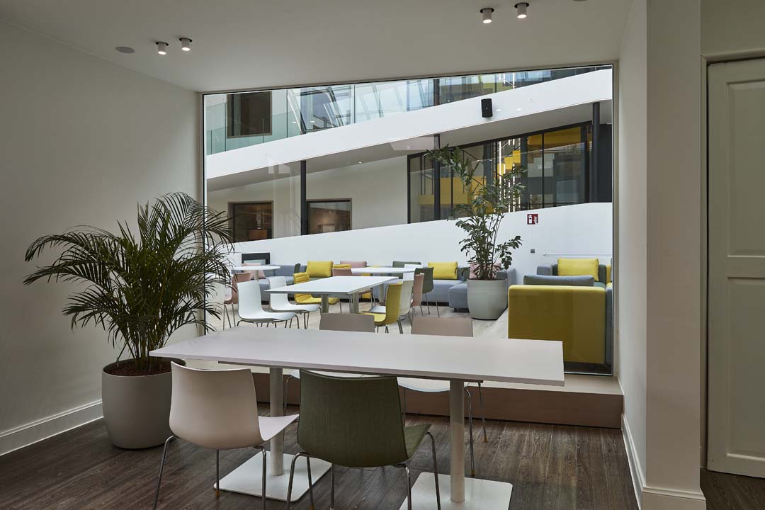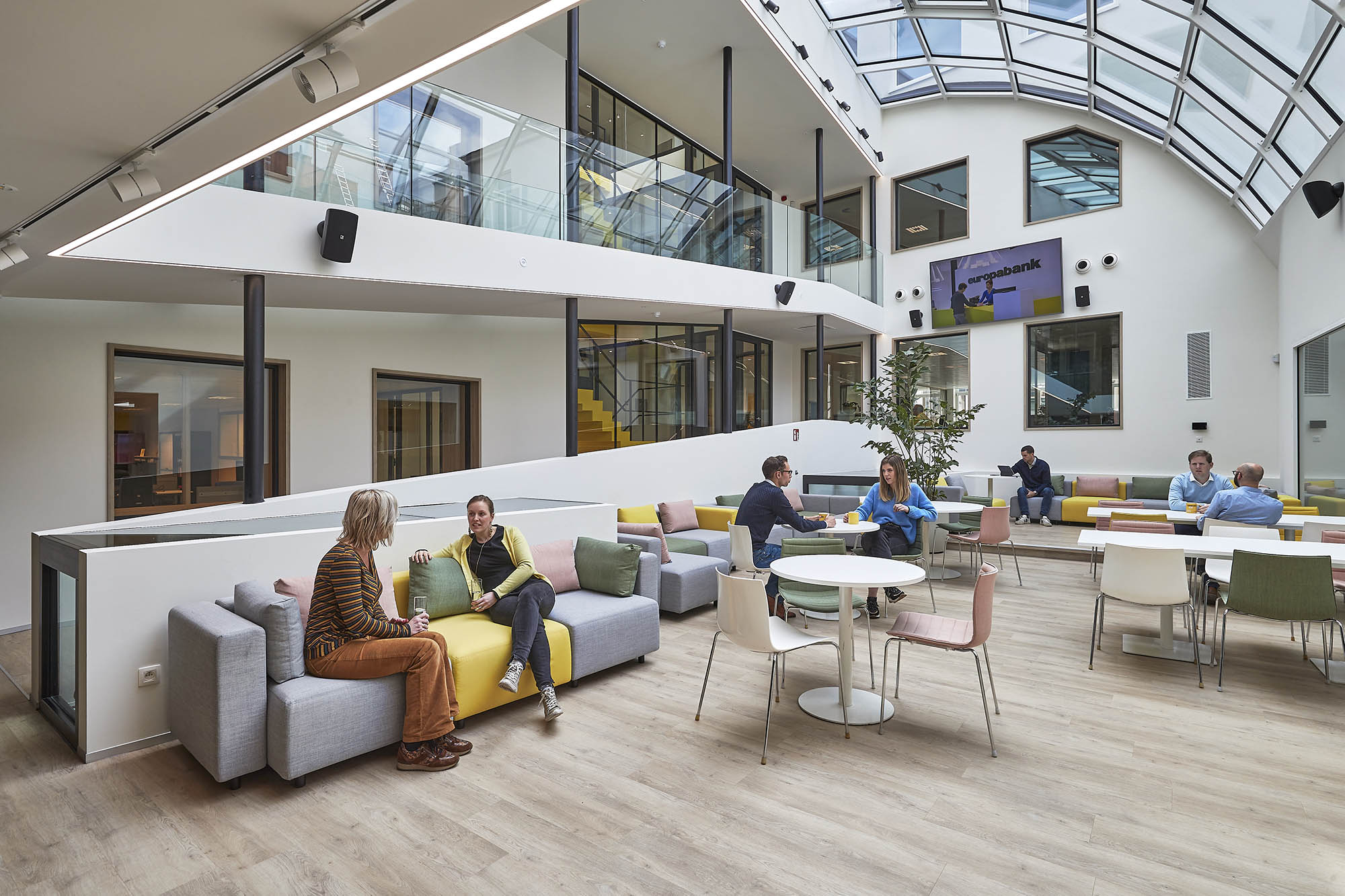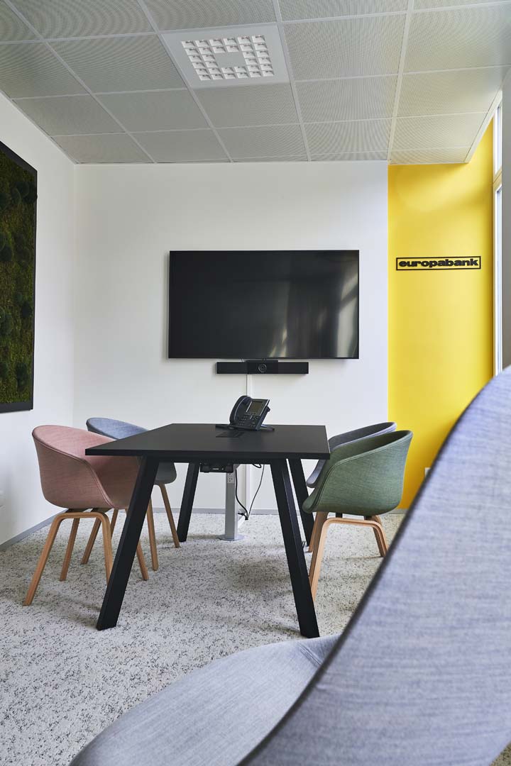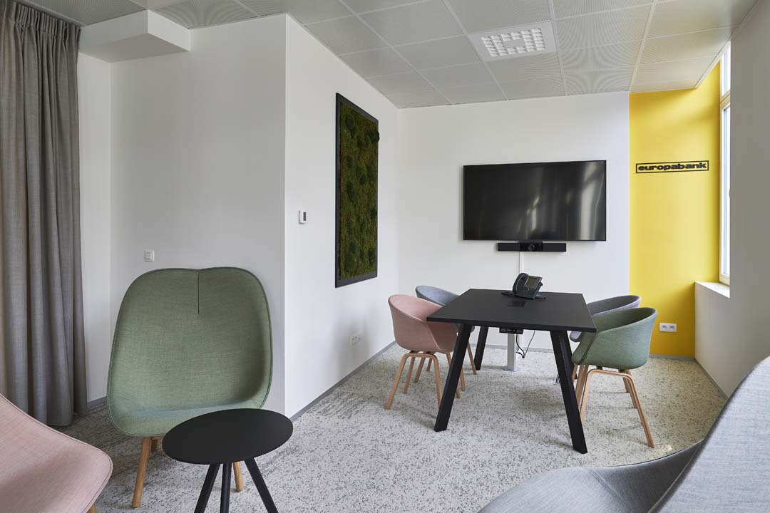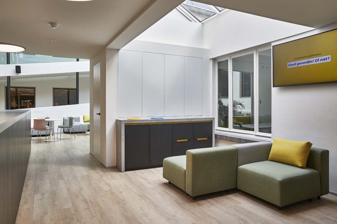 Het gebouw combineert historische charme met moderne efficiëntie. Het atrium, badend in daglicht en omringd door groen, vormt het hart van de werkomgeving. Rondom deze centrale plek vind je kantoren, vergaderzalen en werkzones die allemaal dezelfde sfeer ademen: licht, tactiel en uitnodigend. Pasteltinten, vooral zachte groenen, brengen rust. Geel, de huisstijlkleur van Europabank, zorgt voor subtiele accenten in details zoals handgrepen en decoratie.