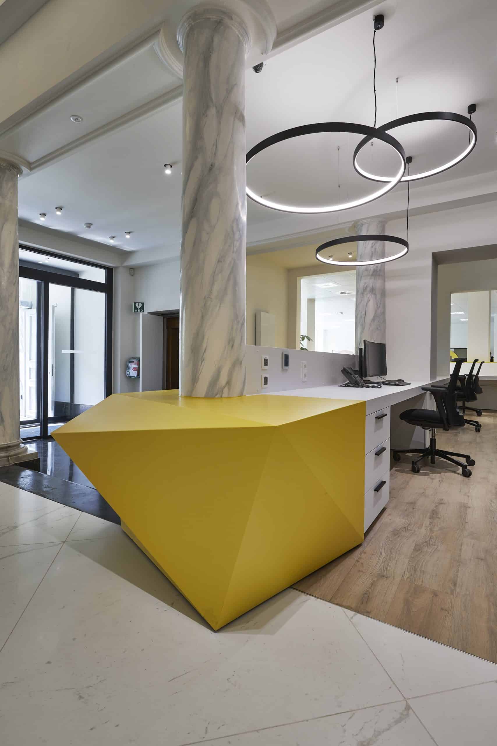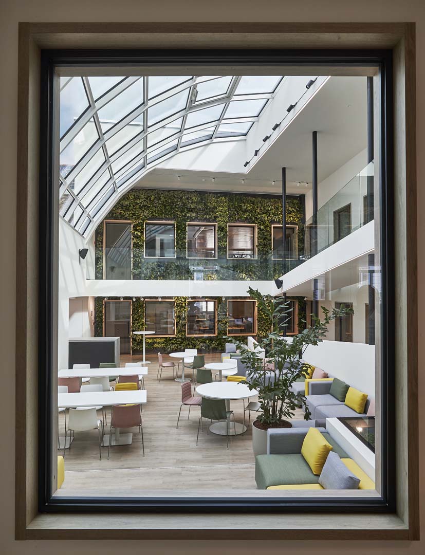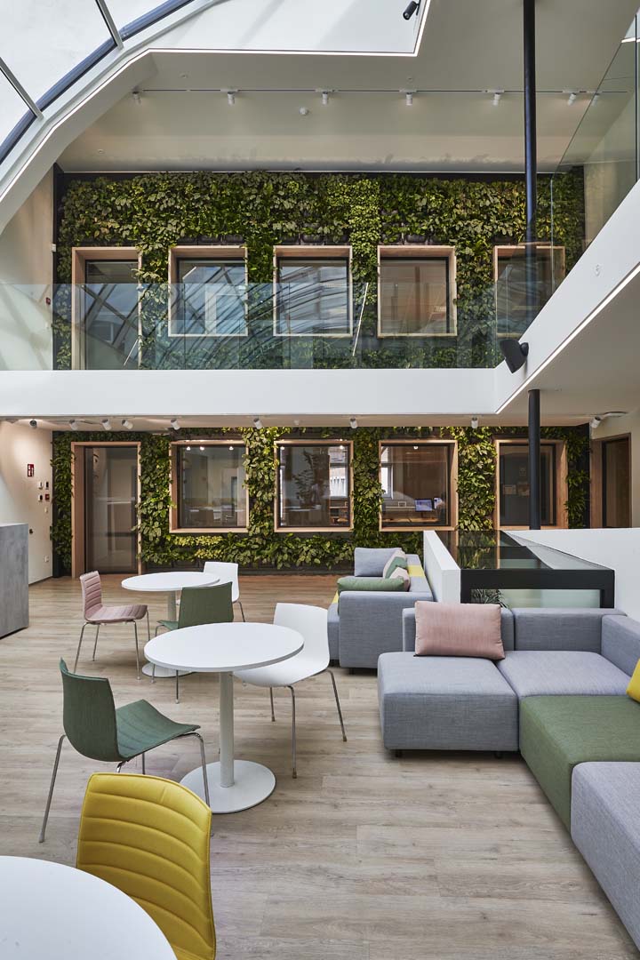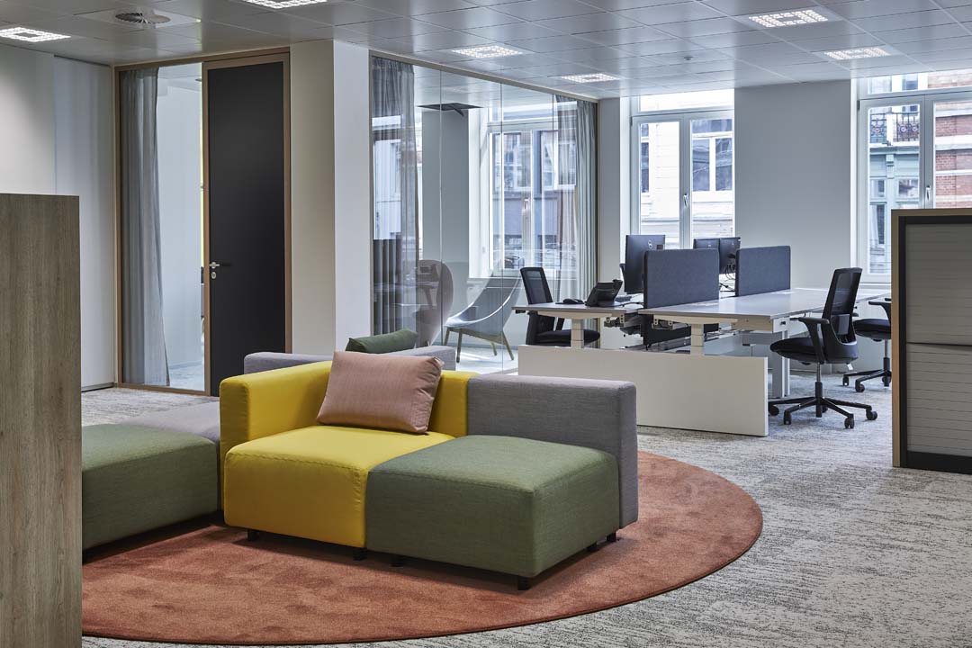 Het gebouw combineert historische charme met moderne efficiëntie. Het atrium, badend in daglicht en omringd door groen, vormt het hart van de werkomgeving. Rondom deze centrale plek vind je kantoren, vergaderzalen en werkzones die allemaal dezelfde sfeer ademen: licht, tactiel en uitnodigend. Pasteltinten, vooral zachte groenen, brengen rust. Geel, de huisstijlkleur van Europabank, zorgt voor subtiele accenten in details zoals handgrepen en decoratie.