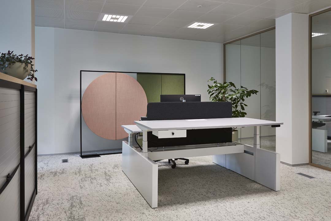 De inrichting is afgestemd op het principe van het nieuwe werken. Zit/sta-bureaus, informele vergaderhoeken en werkboxen creëren variatie en bewegingsvrijheid. In de directievergaderzaal staat een grote tafel met Fenix-blad en een houten sokkel die alle technieken elegant verbergt. Elk element is ontworpen om functionaliteit en esthetiek te combineren.