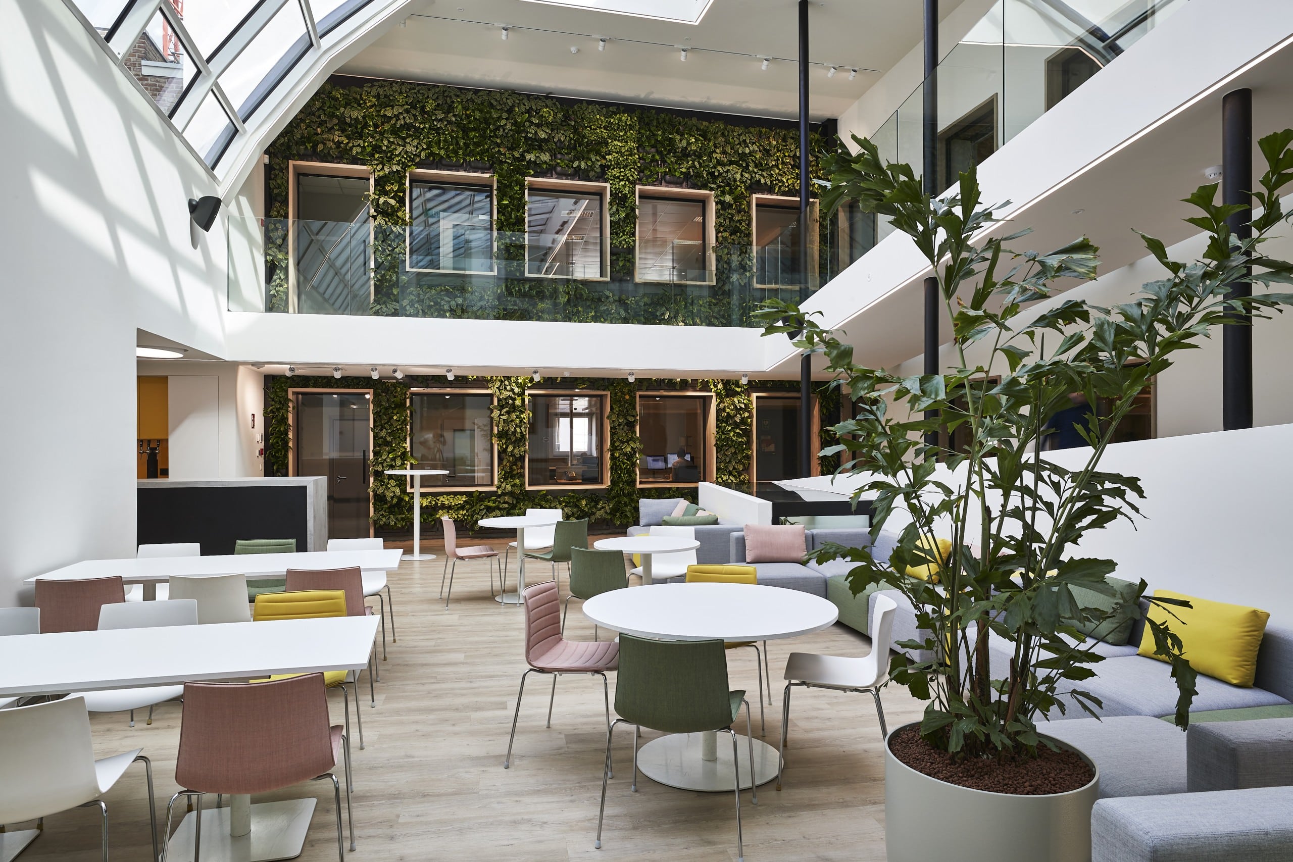 Van afgeronde vormen tot onderhoudsvriendelijke materialen: alles draagt bij aan een kantoor dat niet alleen praktisch is, maar ook aangenaam en herkenbaar. Groenwanden en losse planten versterken het gevoel van huiselijkheid, terwijl kleuraccenten en textuur zorgen voor een warme uitstraling.