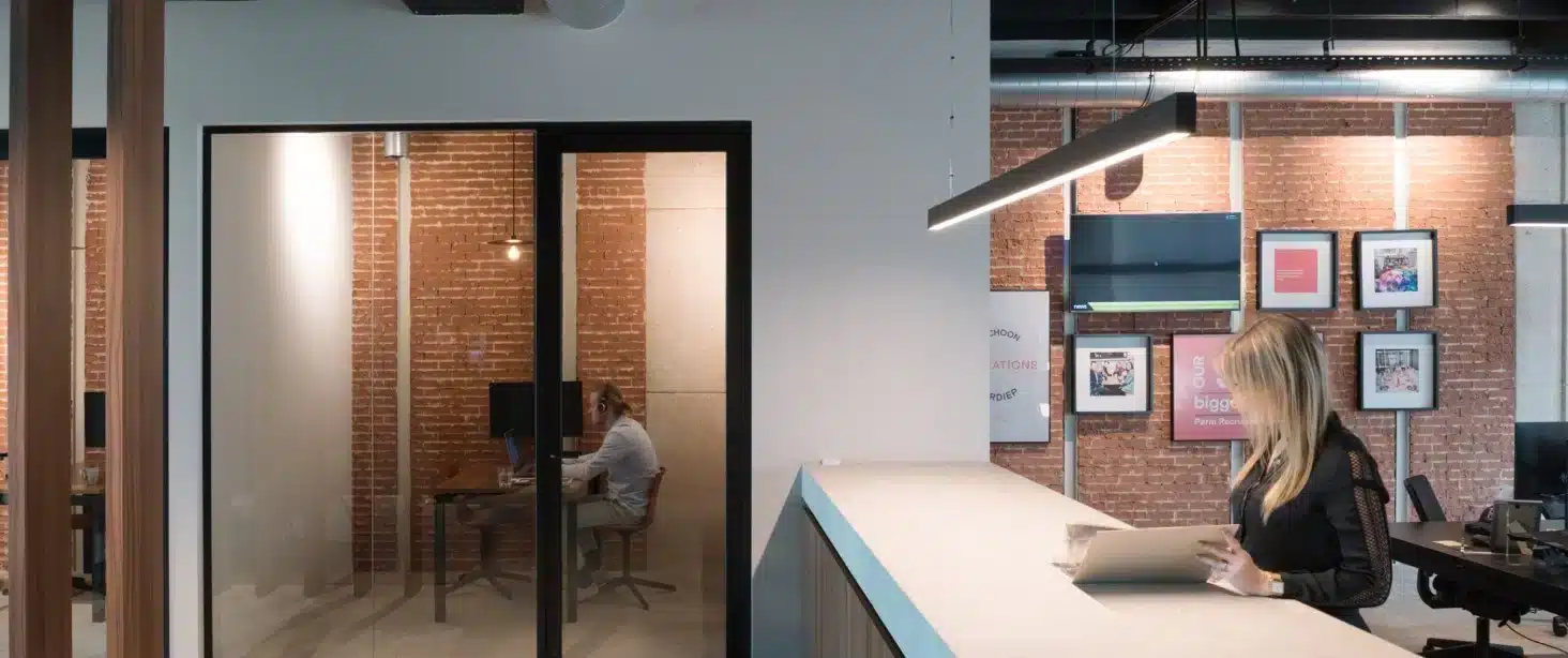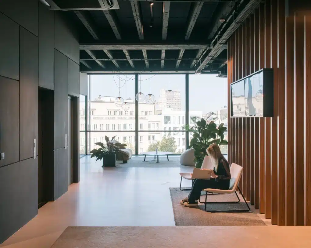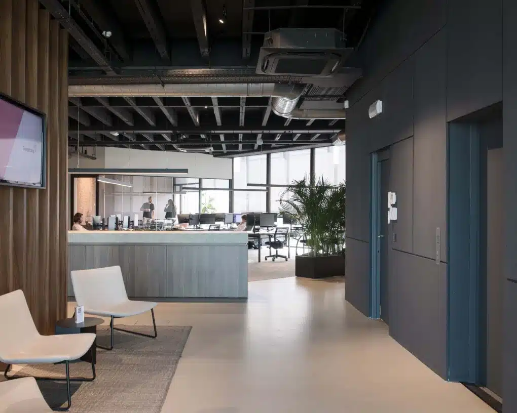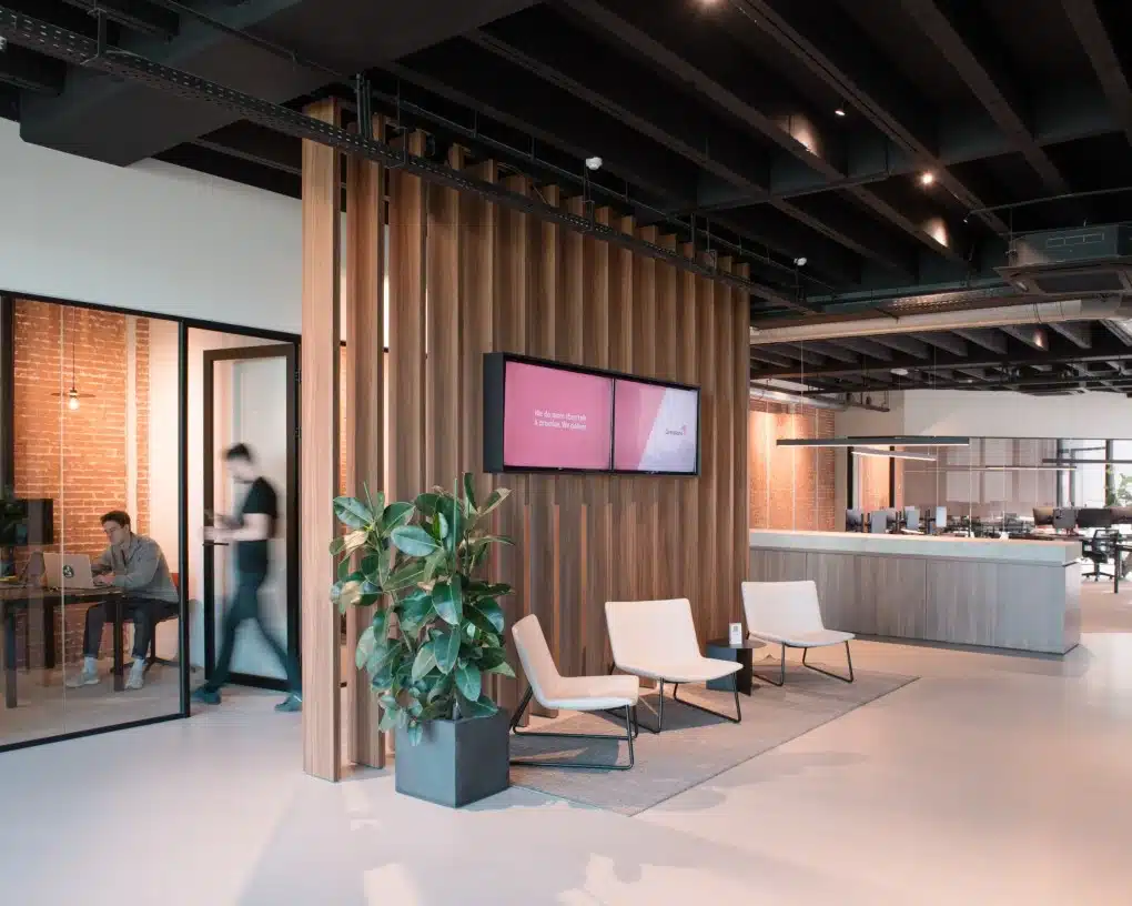 De houten lamellen in notelaar, het marmeren blad van de receptiebalie, de strategisch geplaatste planten, en de zorgvuldig gekozen losse meubelstukken, tapijten en verlichting werken samen om een harmonieus geheel te vormen. Deze elementen dragen bij aan een werkomgeving die niet alleen functioneel is, maar ook visueel aantrekkelijk en inspirerend.
