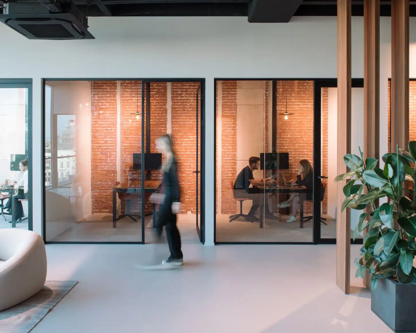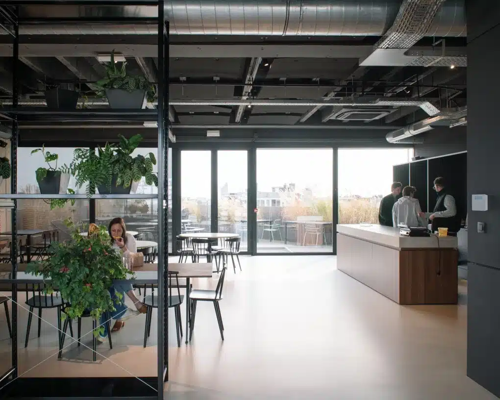 Door de bestaande wit geschilderde bakstenen te zandstralen, kwam de originele rode baksteen tevoorschijn, wat de kantoorruimtes een warme, authentieke uitstraling geeft. In combinatie met het zwarte betonnen plafond en de volledig beglaasde gevel ontstaat er een loftachtige sfeer die doet denken aan de iconische kantoren in New York.