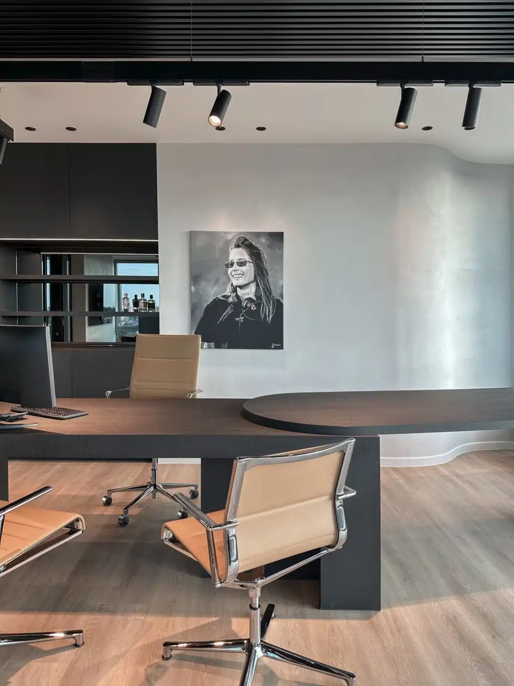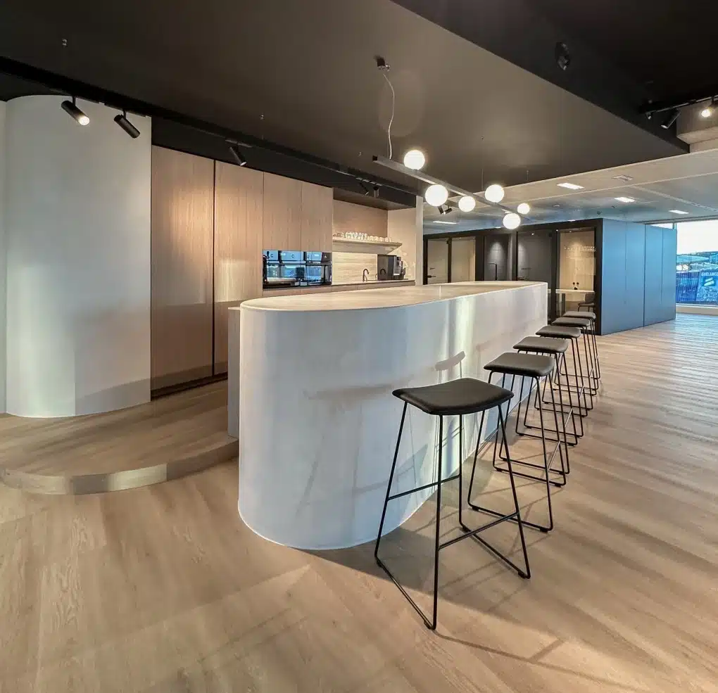 Gezelligheid en functionaliteit gaan hier hand in hand. Warme materialen, doordachte verlichting en een slim ruimtegebruik maken van deze werkplek een plek waar je energie krijgt om je dag te starten.