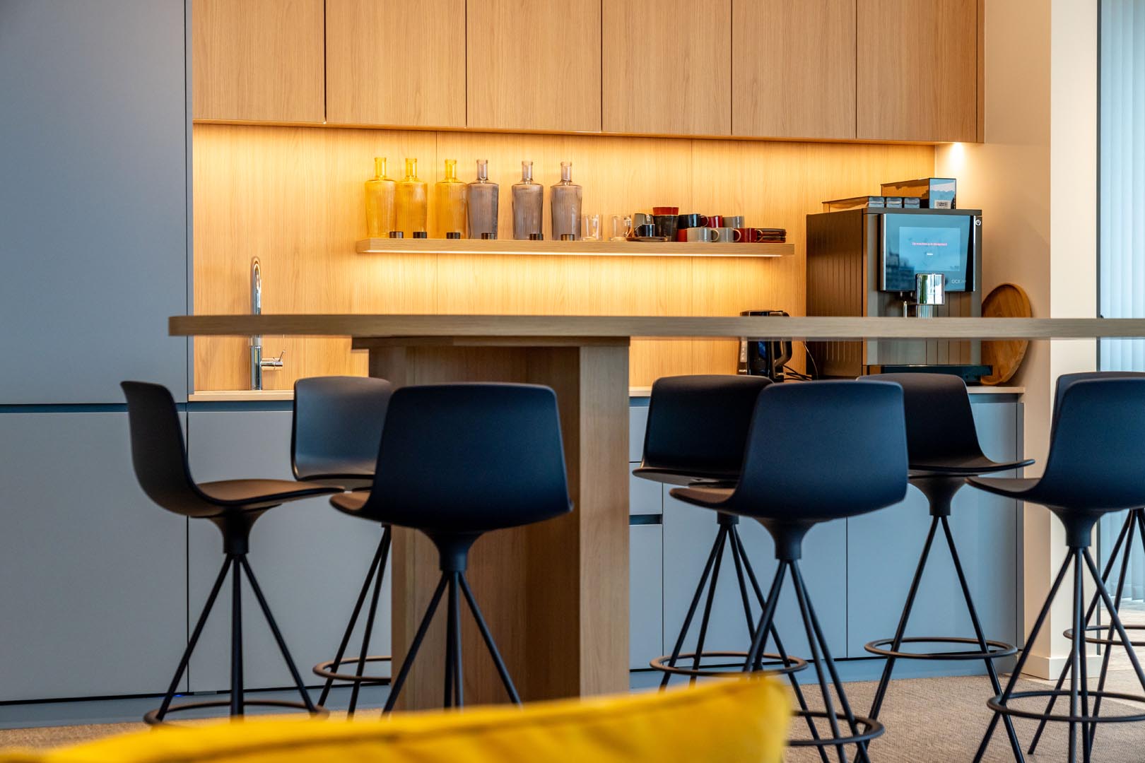 Het kantoor voelt tegelijk professioneel, warm en typisch Port Oostende. Je merkt de zee niet alleen in de kleuren en lijnen, maar ook in de manier waarop je door de ruimte beweegt. Het loopt vanzelf, zoals water dat zijn weg vindt.