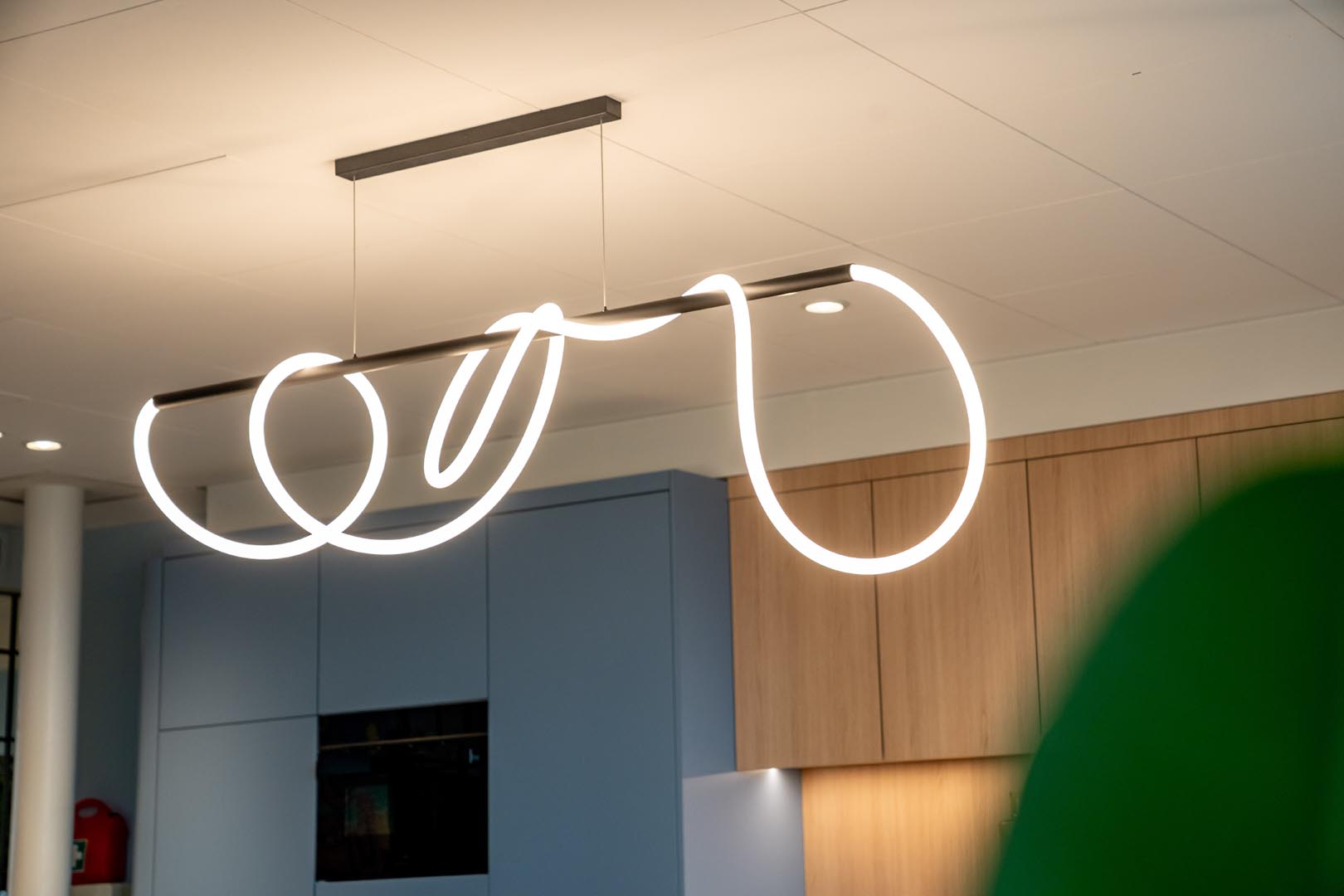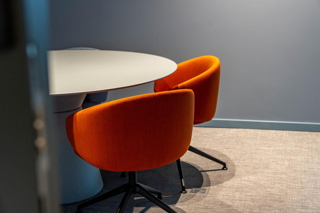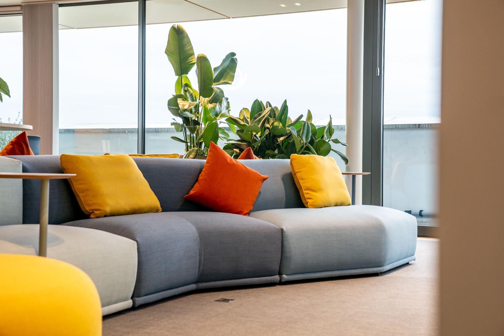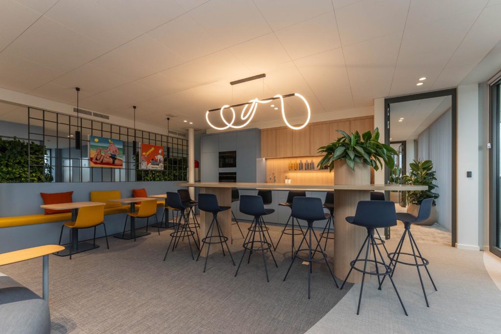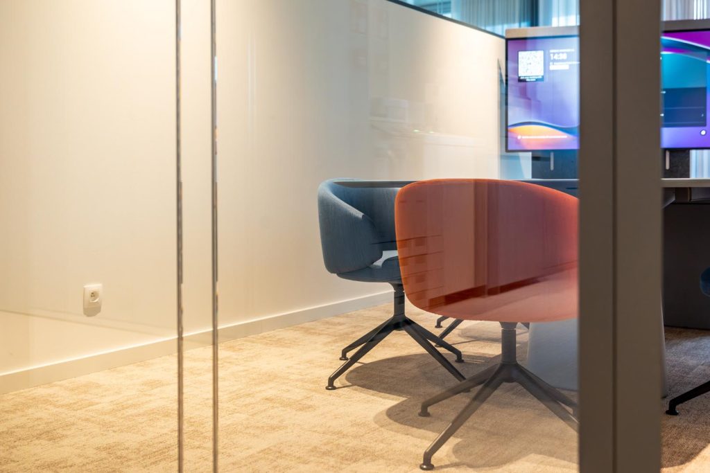 In de werkzones bleven we bewust zachter en meer neutraal zodat je hoofd tot rust komt. De uitgesproken kleuren zitten vooral op plekken waar mensen samenkomen.