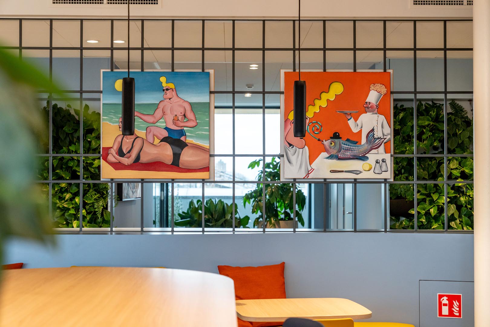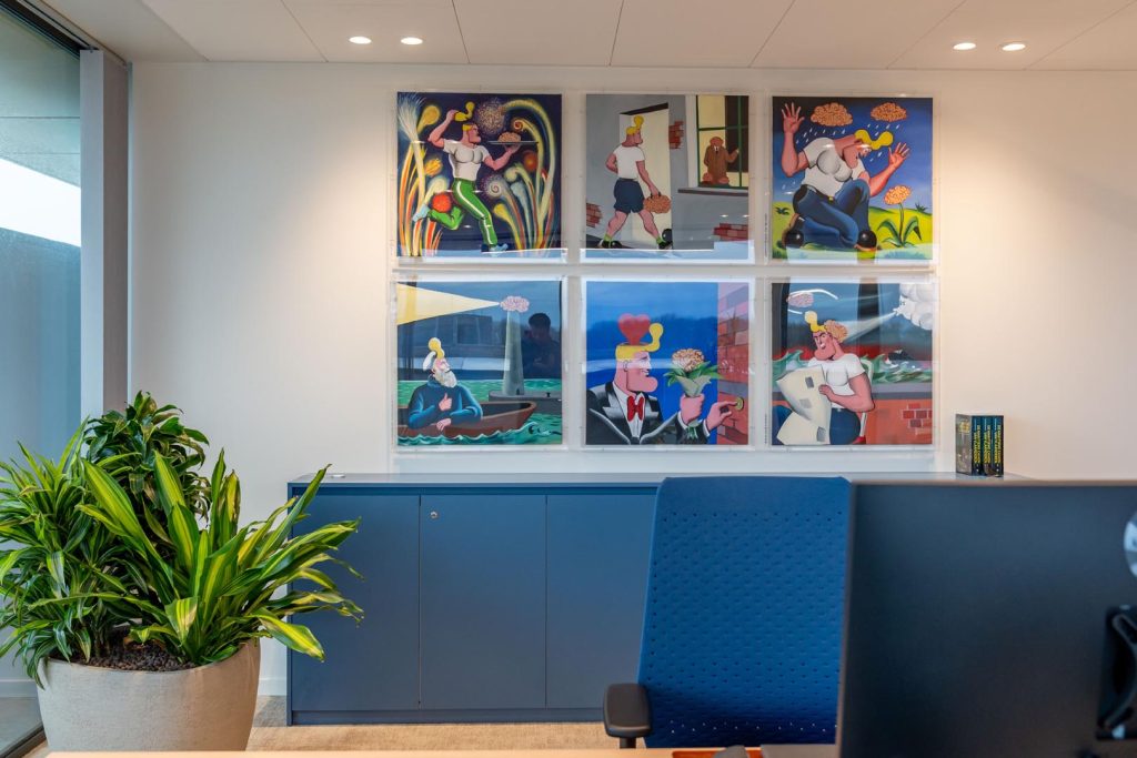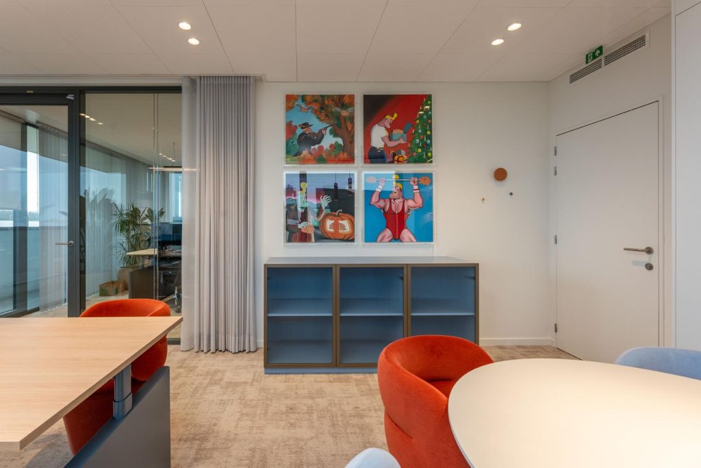 De kleuren komen uit twee bronnen die perfect bij Port Oostende passen: de zee en de kunst van Safe (Cowboy) Henk, die ze graag in hun kantoor wilden tonen. Daardoor werd het kleurenverhaal automatisch speelser, zonder luid te worden.