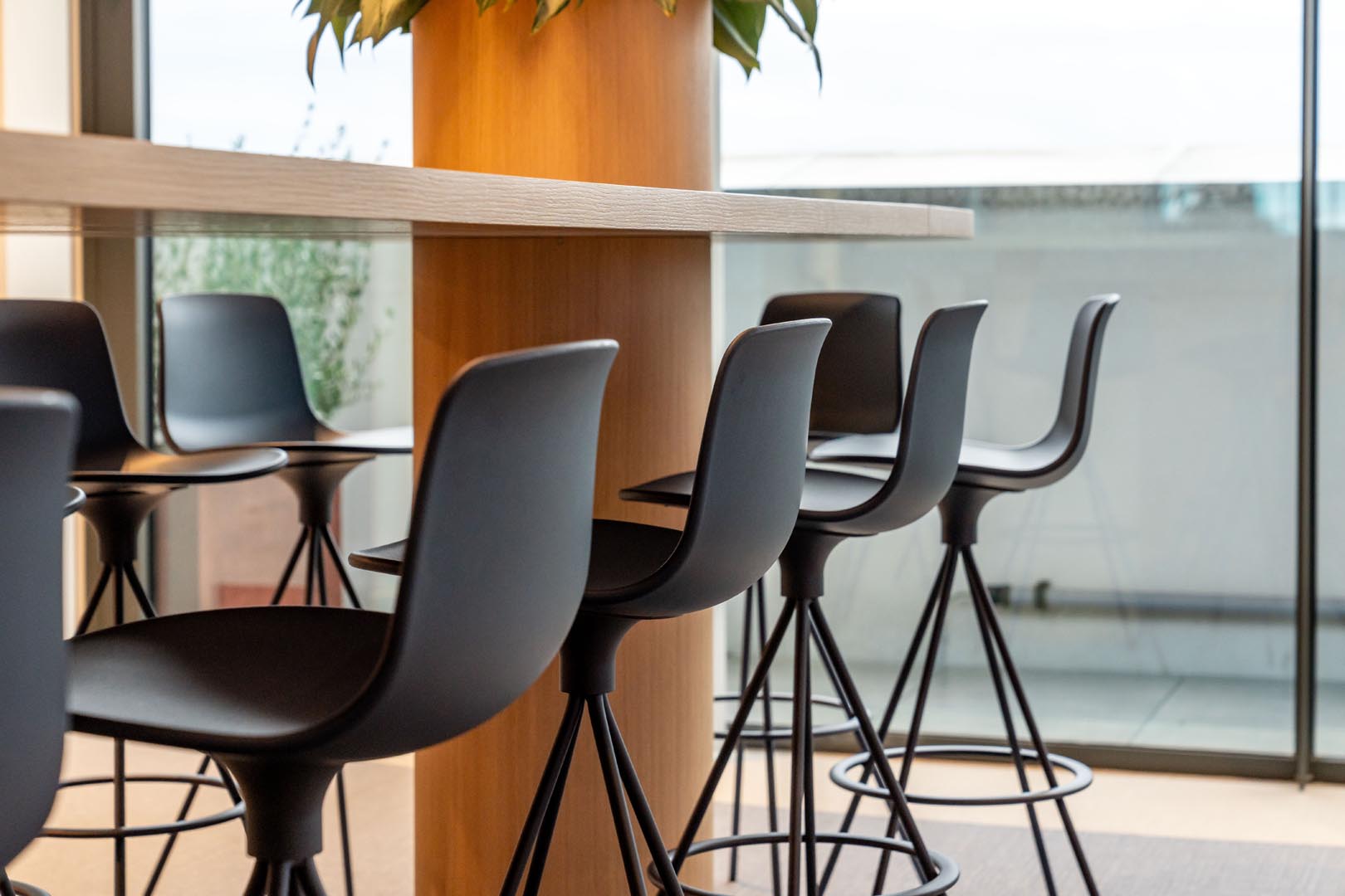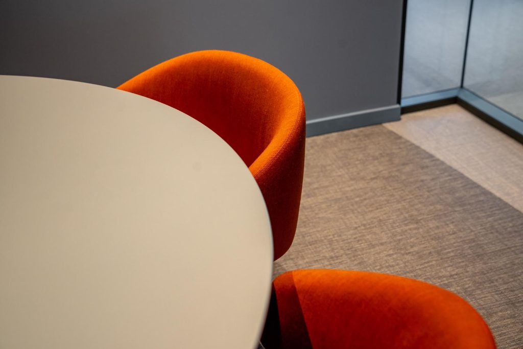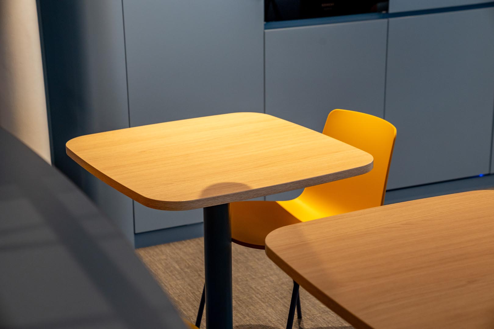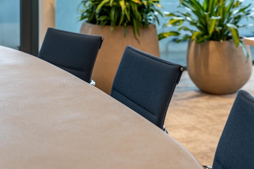 Stapelhuis Entrepot heeft een robuuste, bijna ruwe uitstraling. Daarom kozen we voor meubilair met afgeronde en organische vormen. Ronde vergadertafels, een zachte vorm voor het keukeneiland en stoelen zonder harde lijnen.