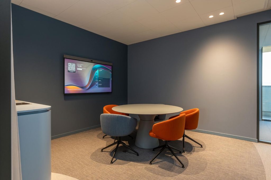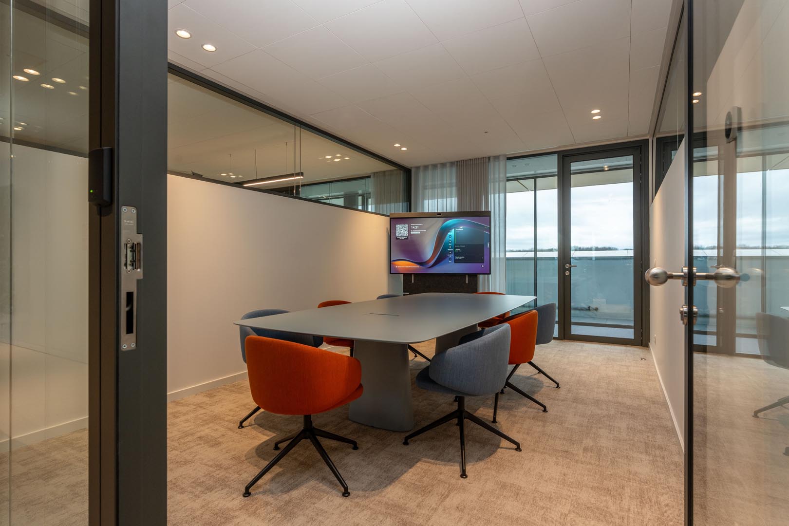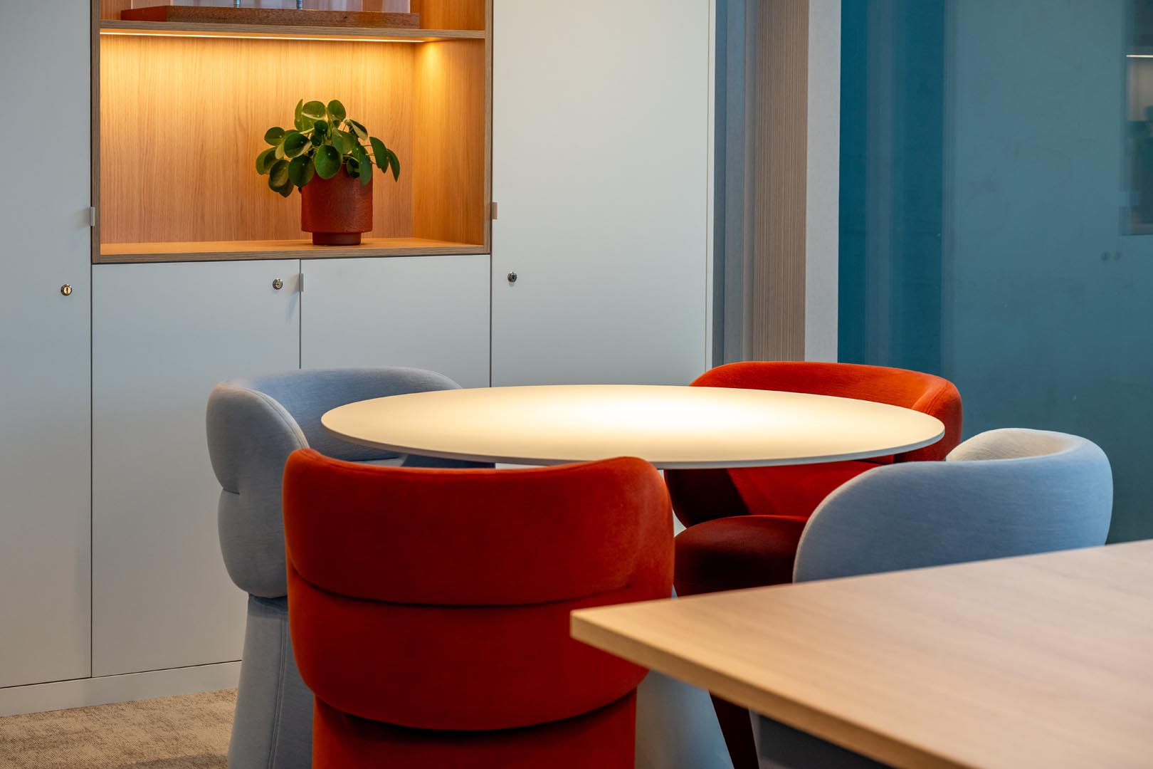 Een vergaderruimte moet uitnodigen om binnen te stappen, en in zo’n indrukwekkend gebouw draait het ook om hoe je de circulatie zachter maakt, zodat het geheel vriendelijk en natuurlijk aanvoelt. Door het concept laag per laag te verfijnen, groeide het uit tot een kantoor dat rust brengt en tegelijk zijn eigen karakter houdt.