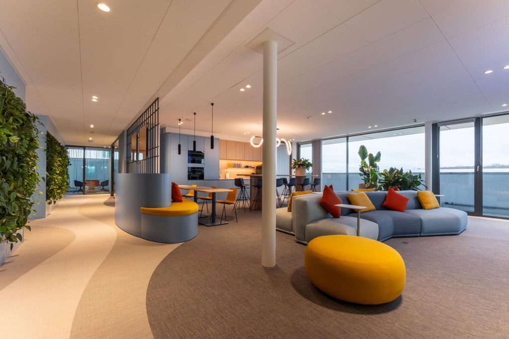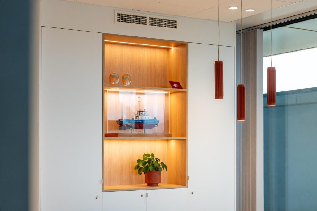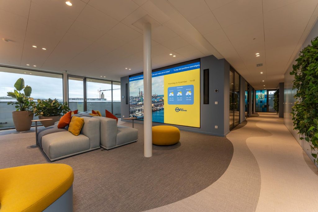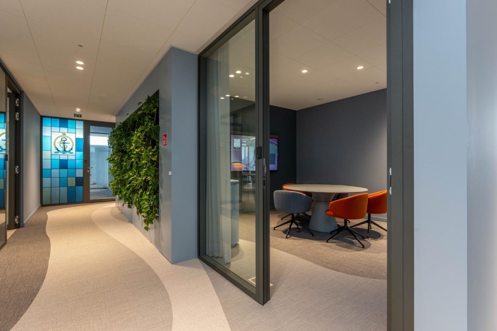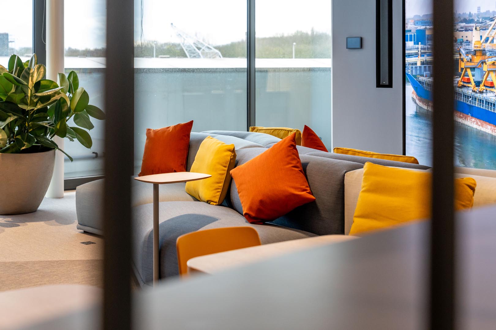 De blauwe tinten verwijzen naar de haven en lopen door in tapijt, wanden en maatwerk. Ze zorgen voor rust en herkenbaarheid. De warme roestkleur brengt balans en knipoogt subtiel naar staal en kades. In andere ruimtes combineren we het blauw met okergeel, turkoois en koraal. Dat maakt het geheel levendig maar toch rustig voor het oog.