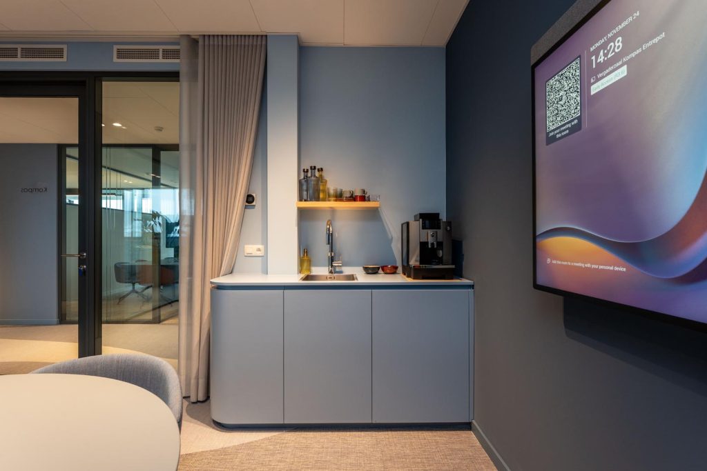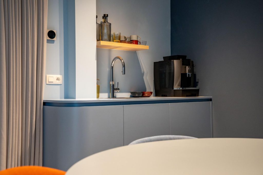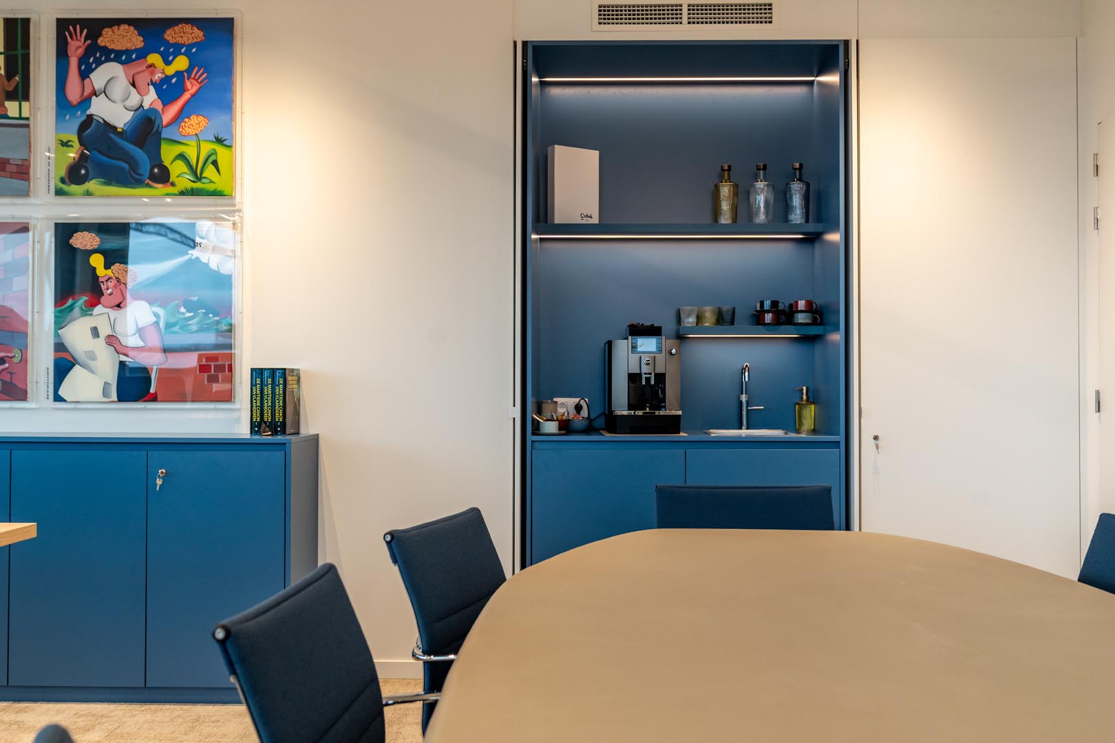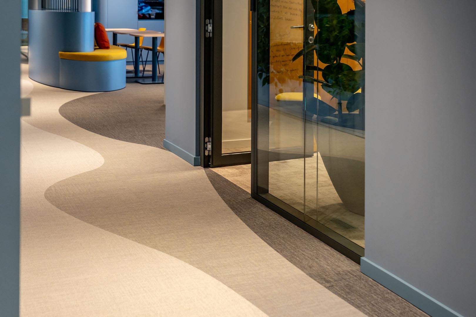 De blauwe tinten verwijzen naar de haven en lopen door in tapijt, wanden en maatwerk. Ze zorgen voor rust en herkenbaarheid. De warme roestkleur brengt balans en knipoogt subtiel naar staal en kades. In andere ruimtes combineren we het blauw met okergeel, turkoois en koraal. Dat maakt het geheel levendig maar toch rustig voor het oog.