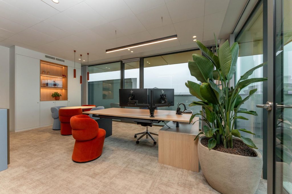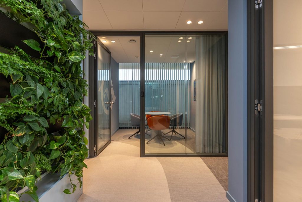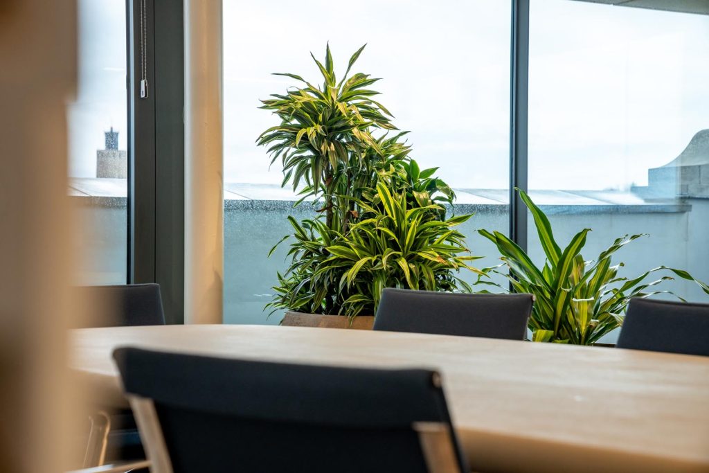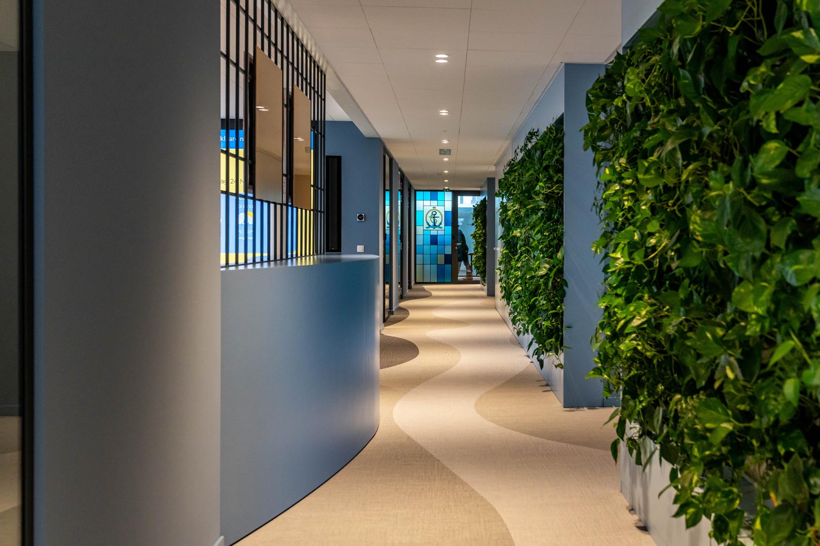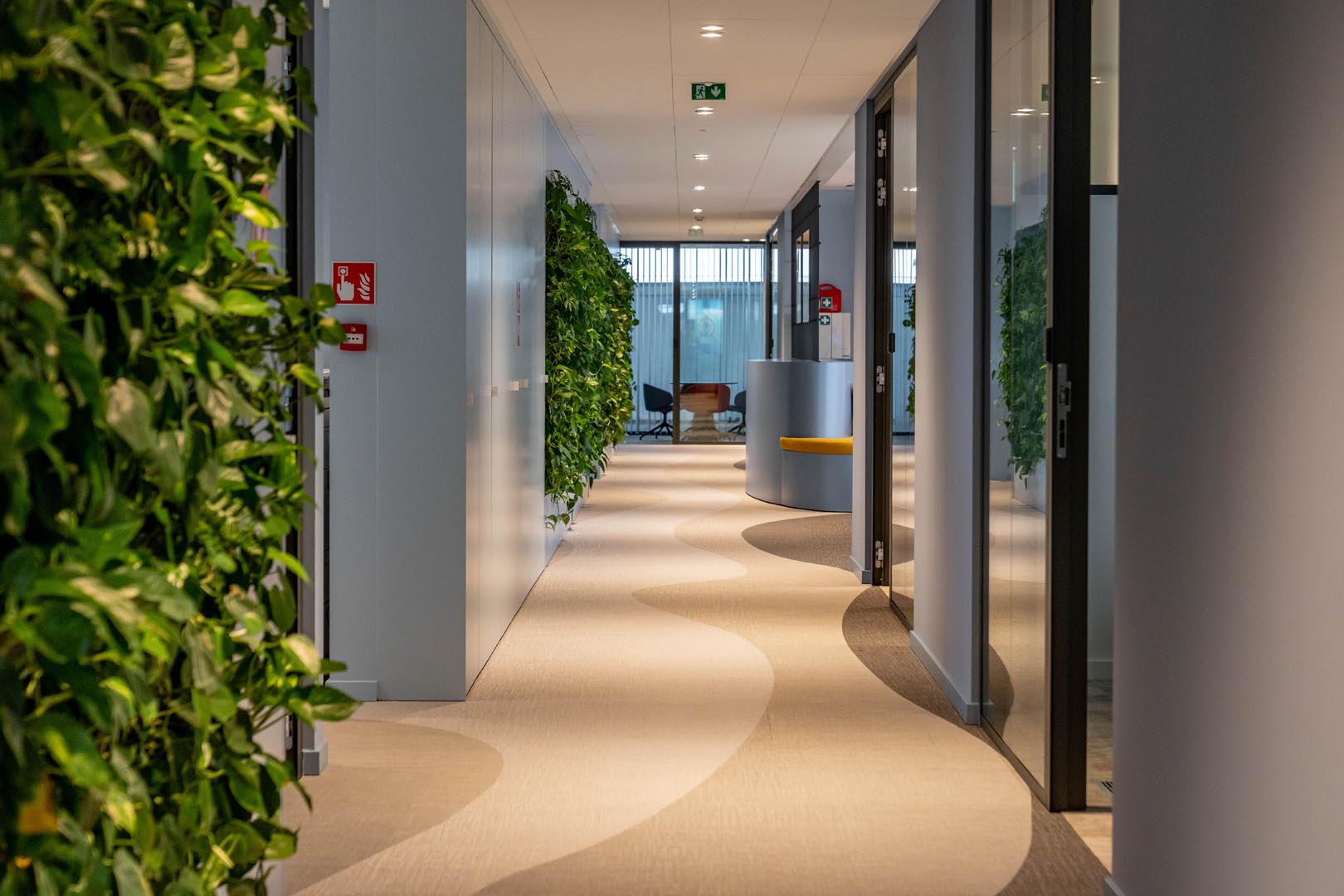 Groen geeft het kantoor zijn ademruimte. De groene wand in de gang en de grote plantenbakken doorheen het kantoor zorgen voor zachtere zichtlijnen en meer rust in de ruimtes. Het maakt de omgeving lichter en aangenamer, ook op drukke momenten.