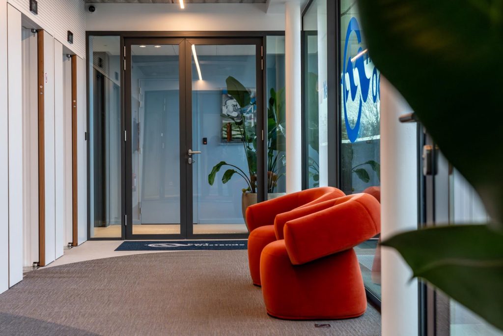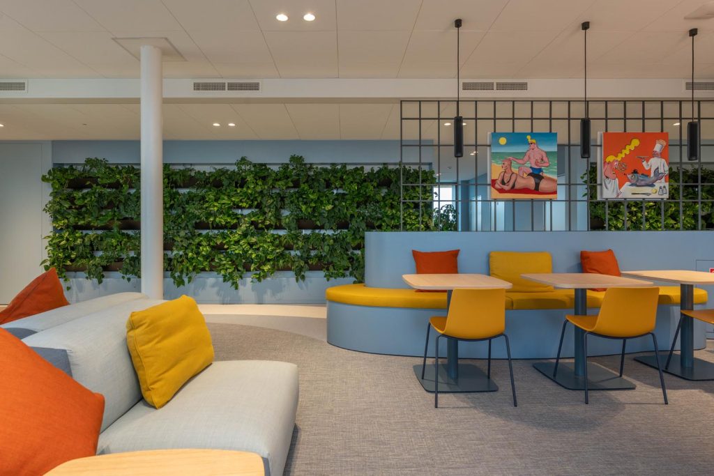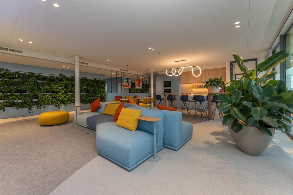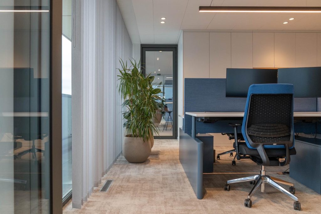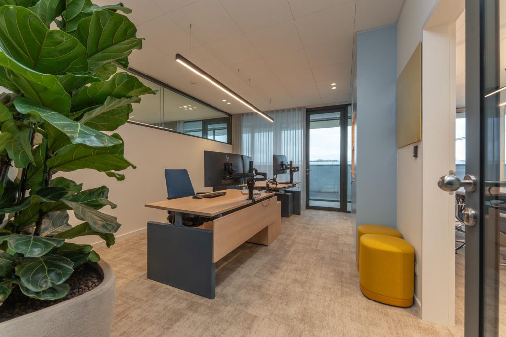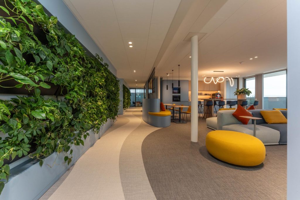 Groen geeft het kantoor zijn ademruimte. De groene wand in de gang en de grote plantenbakken doorheen het kantoor zorgen voor zachtere zichtlijnen en meer rust in de ruimtes. Het maakt de omgeving lichter en aangenamer, ook op drukke momenten.