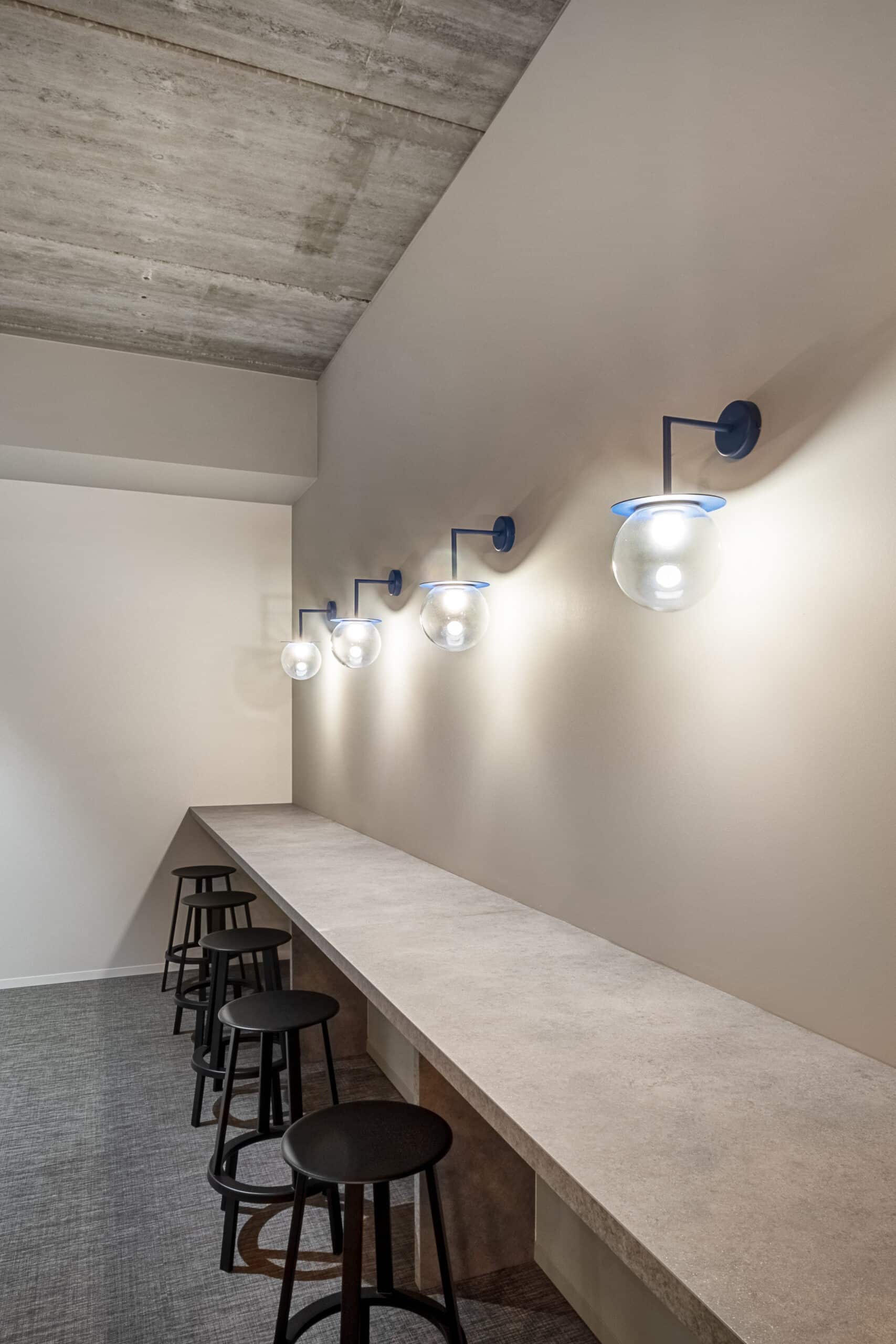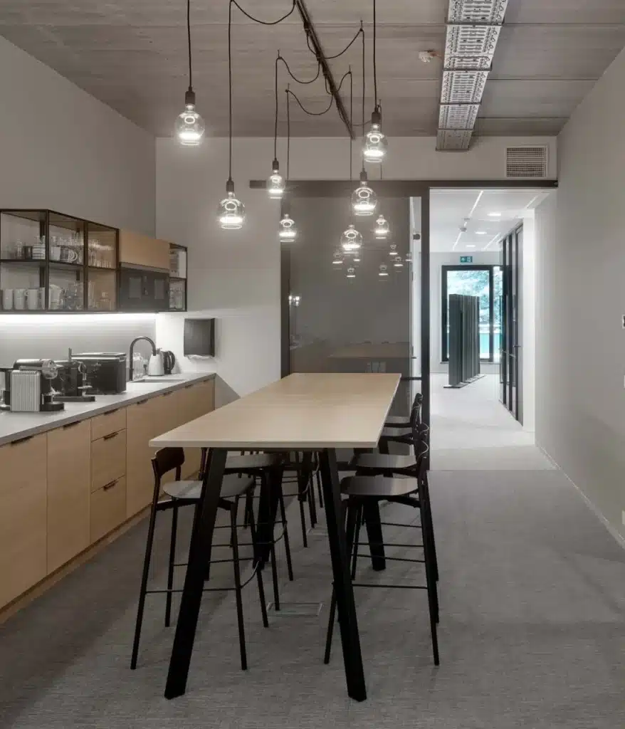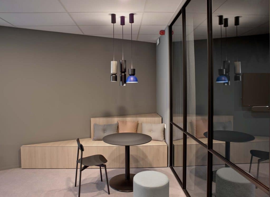 Sequana Medical wilde een werkplek die de samenwerking bevordert, maar ook focus en rust toelaat. Door strategisch geplaatste vergaderboxen ontstaat er een natuurlijke zonering in het kantoor. Zo creëerden we zones voor overleg, concentratie én ontmoeting, De multifunctionele keuken- en flexzone vormt het hart van het kantoor. Hier kom je samen voor lunch, een koffiebreak, een snelle meeting of een uurtje gefocust werken tussen twee afspraken door. De losse combinatie van zithoogtes, kleuren en verlichting maakt deze ruimte laagdrempelig en levendig.