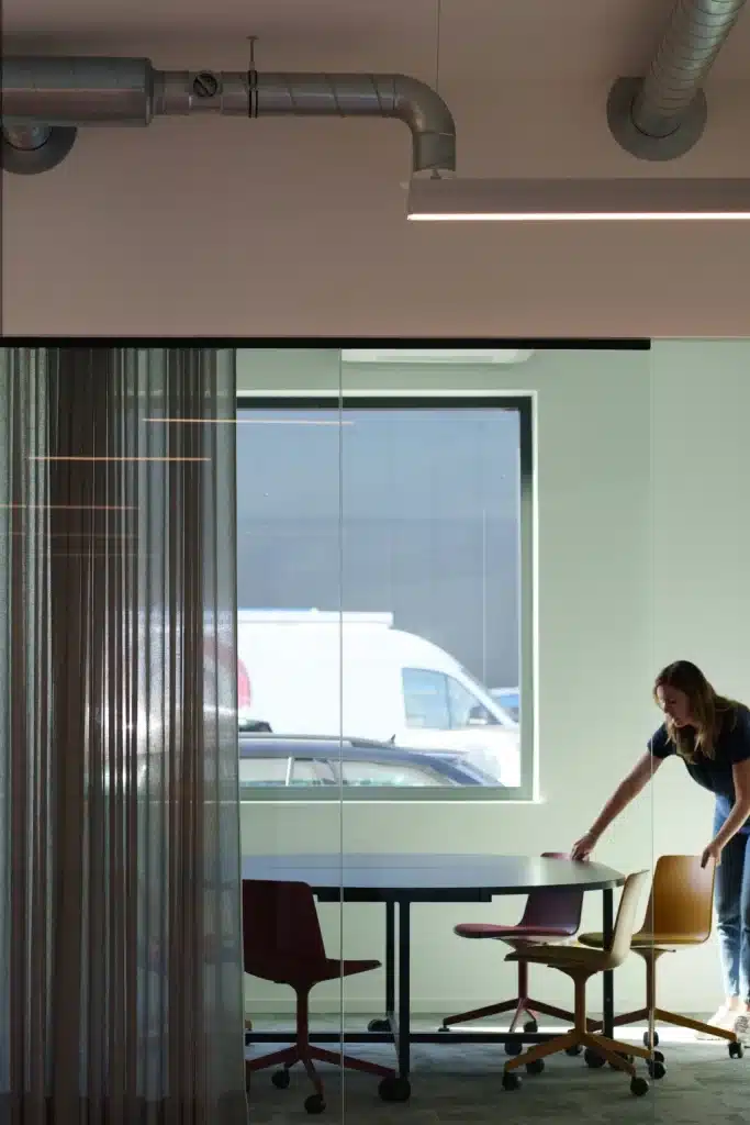 Ook de ingemaakte kasten zijn een echte eyecatcher. Nane: “Die lieten we op maat maken zodat SomatiFIE er producten in kan etaleren.” Alle bureaus zijn nu flexdesks, behalve die voor het managementteam. “Maar daar kozen we dan weer voor glazen wanden die uitgeven op de gang, wat het gevoel van nabijheid, interactie en dynamiek ten goede komt”, legt Nane uit.