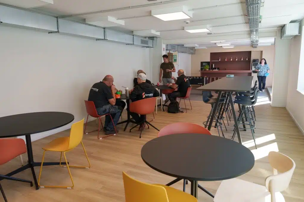 “We wilden een combinatie van gezelligheid en functionaliteit”, vertelt SomatiFIE’s algemeen directeur Wim Janssens, “en een subtiele vertaling van onze huisstijl.” Die bestaat – wat had je anders verwacht – vooral uit rood, geel, zwart en oranje. Ook diversiteit in het soort werk- en vergaderruimtes stond op de verlanglijst.