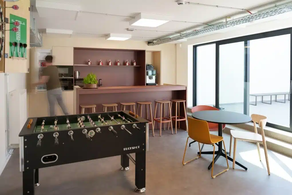 “Na een salesmeeting wordt in de keuken wel eens een flesje opengetrokken”, vertelt Lenny. Ook de knusse inkom en de binnentuin lenen zich perfect tot fijne ontmoetingen voor, tijdens of na het werk. “En dan zijn er nog de hoekjes waar je kunt samenzitten met je collega’s. Heel tof!”