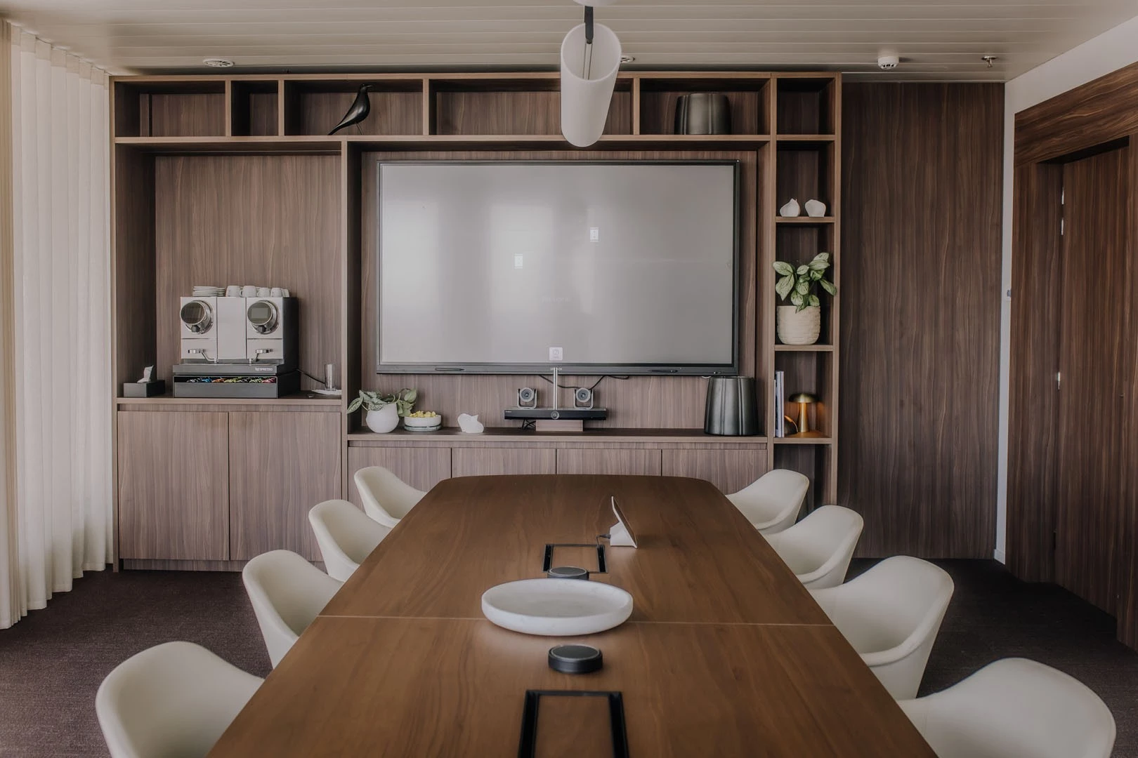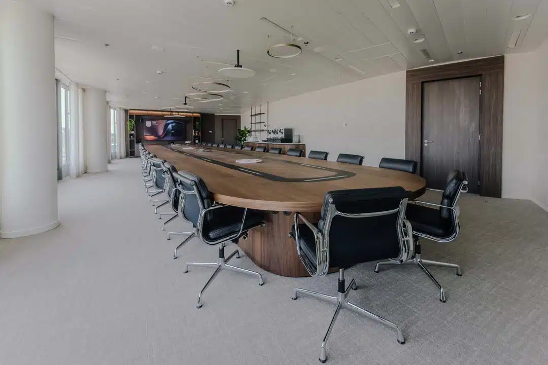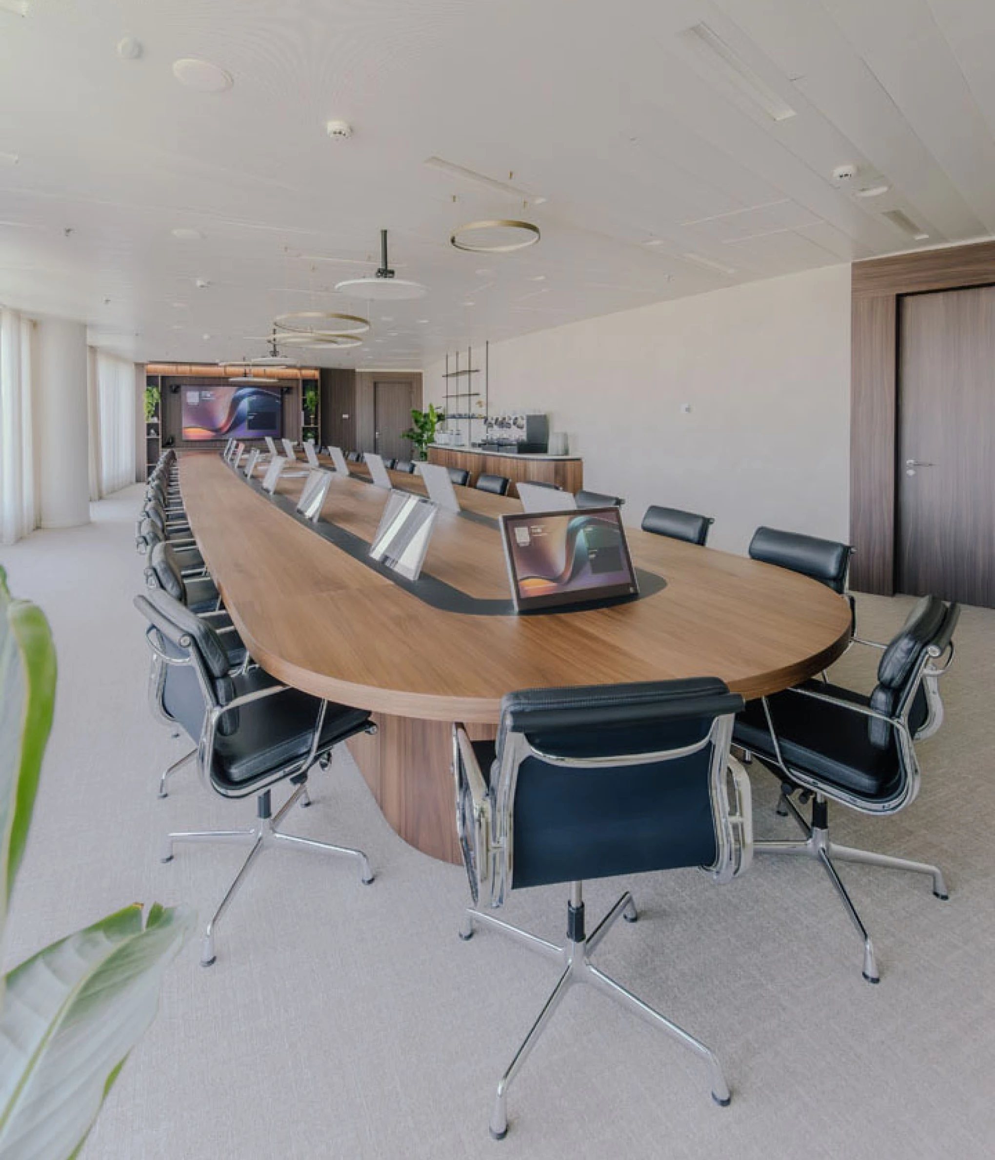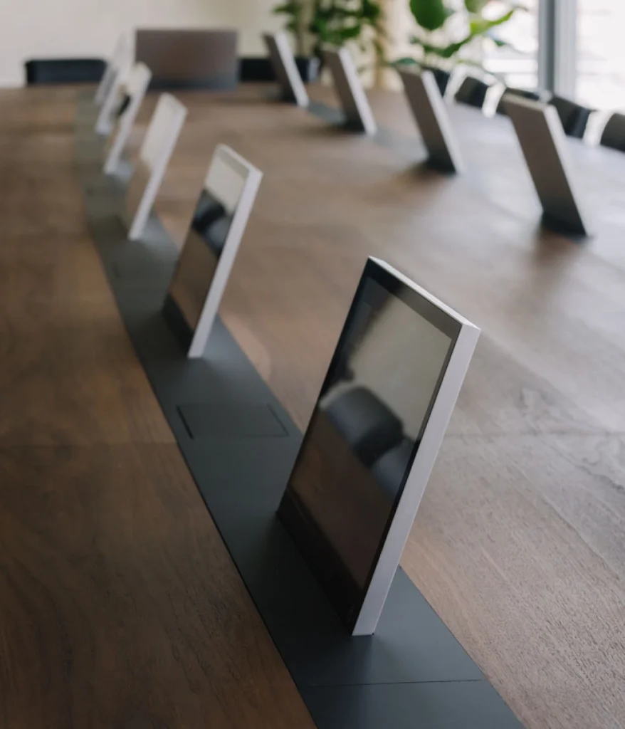 In de indrukwekkende boardroom combineerden we technologische innovatie met verfijnd design. De op maat gemaakte vergadertafel is uitgerust met ingewerkte tv-schermen die enkel zichtbaar zijn wanneer nodig.