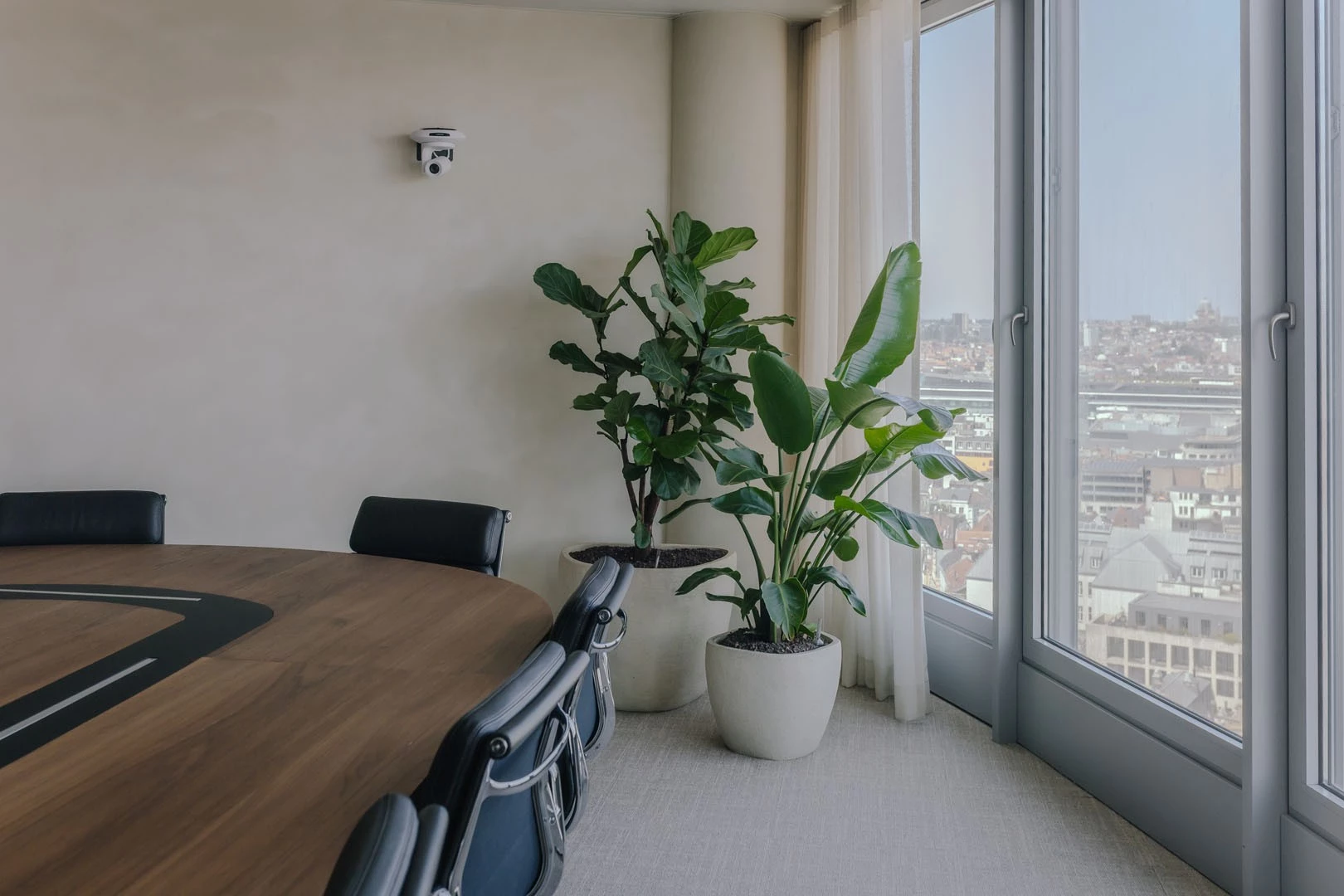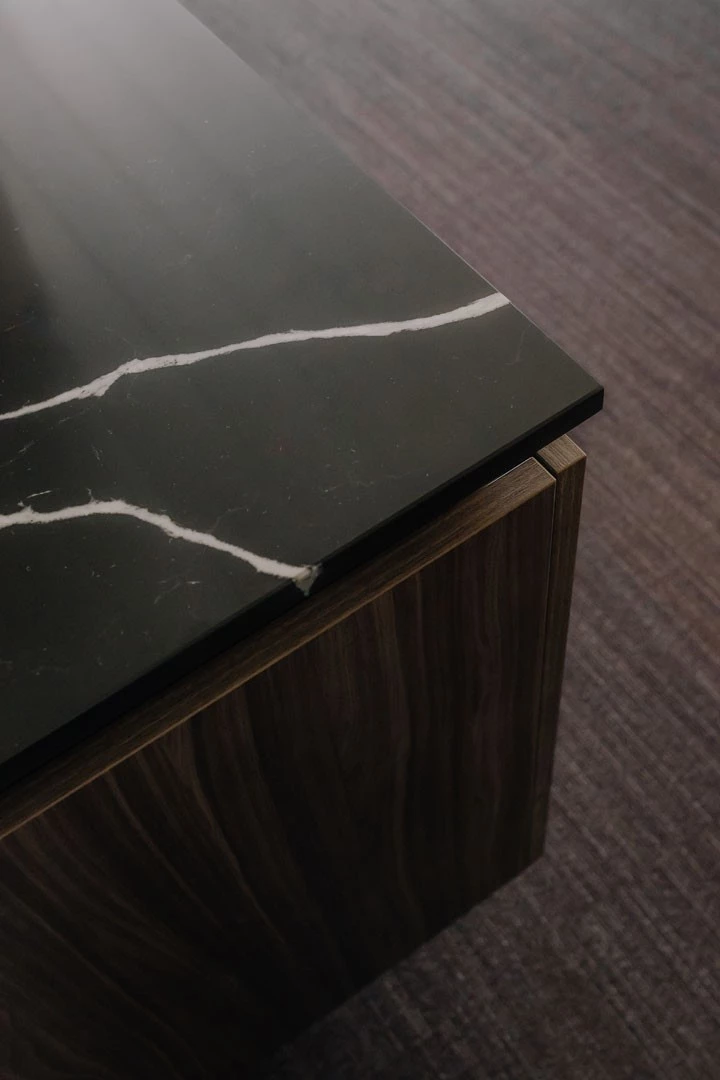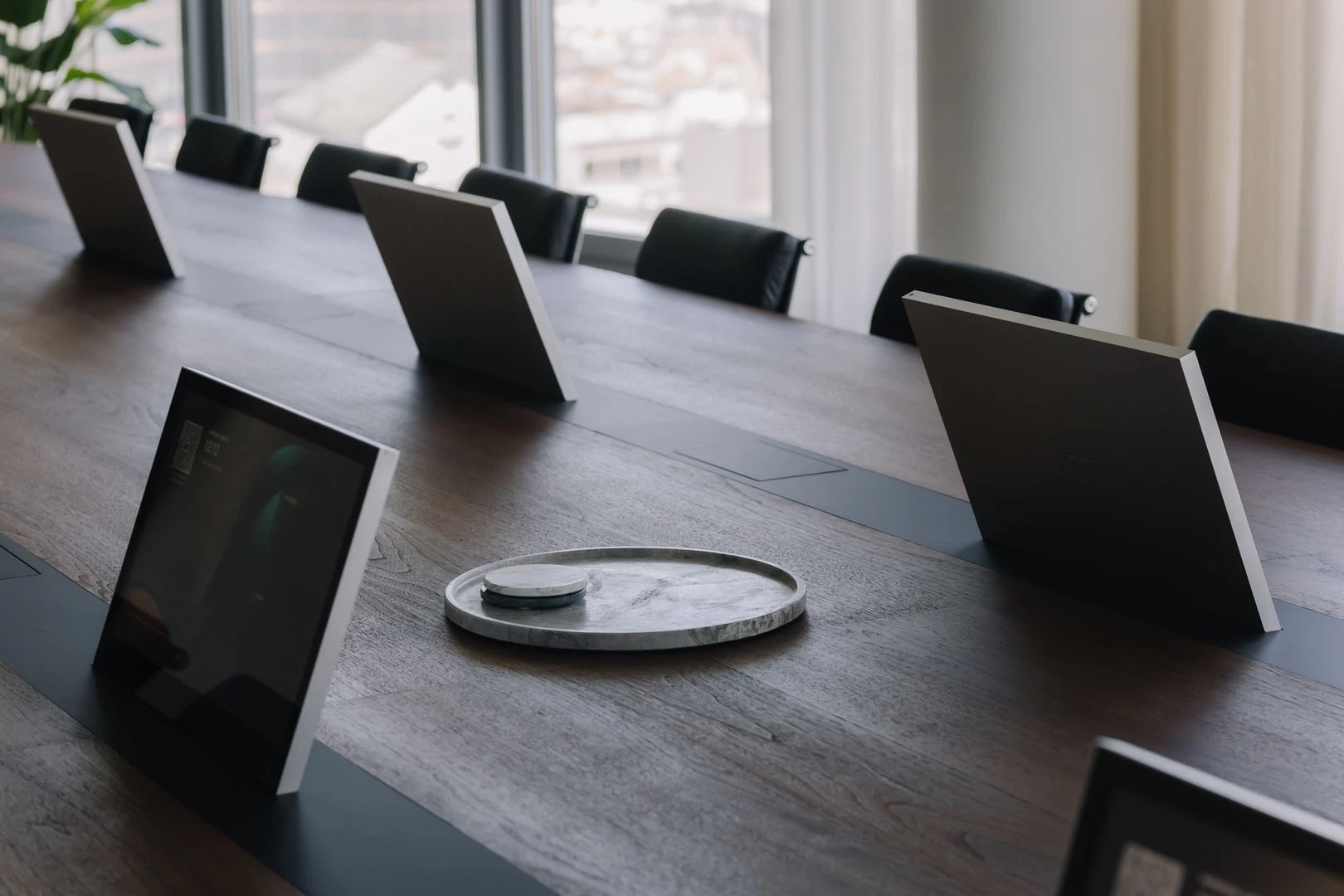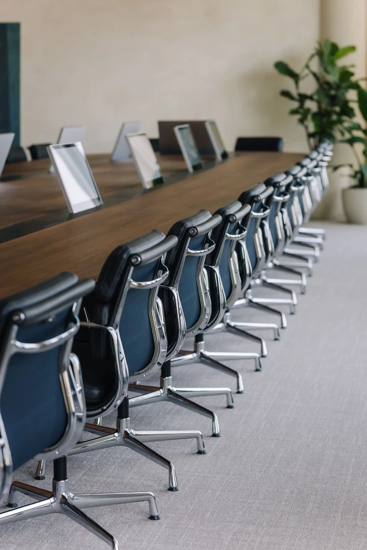 In de indrukwekkende boardroom combineerden we technologische innovatie met verfijnd design. De op maat gemaakte vergadertafel is uitgerust met ingewerkte tv-schermen die enkel zichtbaar zijn wanneer nodig.