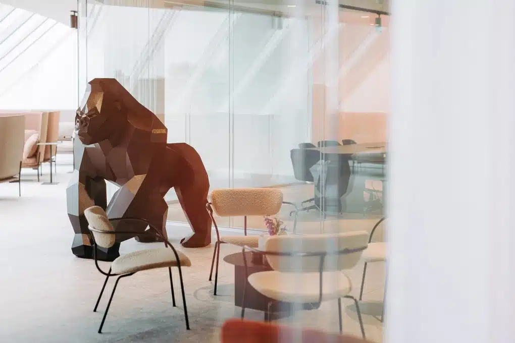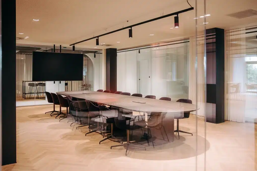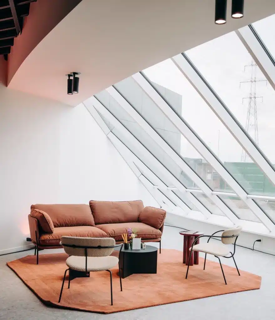 Onze interieurarchitecten werkten het meubilair uit op basis van het moodboard van de architect. We stemden kleuren, materialen en silhouetten zorgvuldig af, zodat het plaatje klopte tot in het kleinste detail. Afgeronde meubels, wollige stoffen en warme tinten zorgen voor een gevoel van rust en connectie, zonder het zakelijke karakter te verliezen.